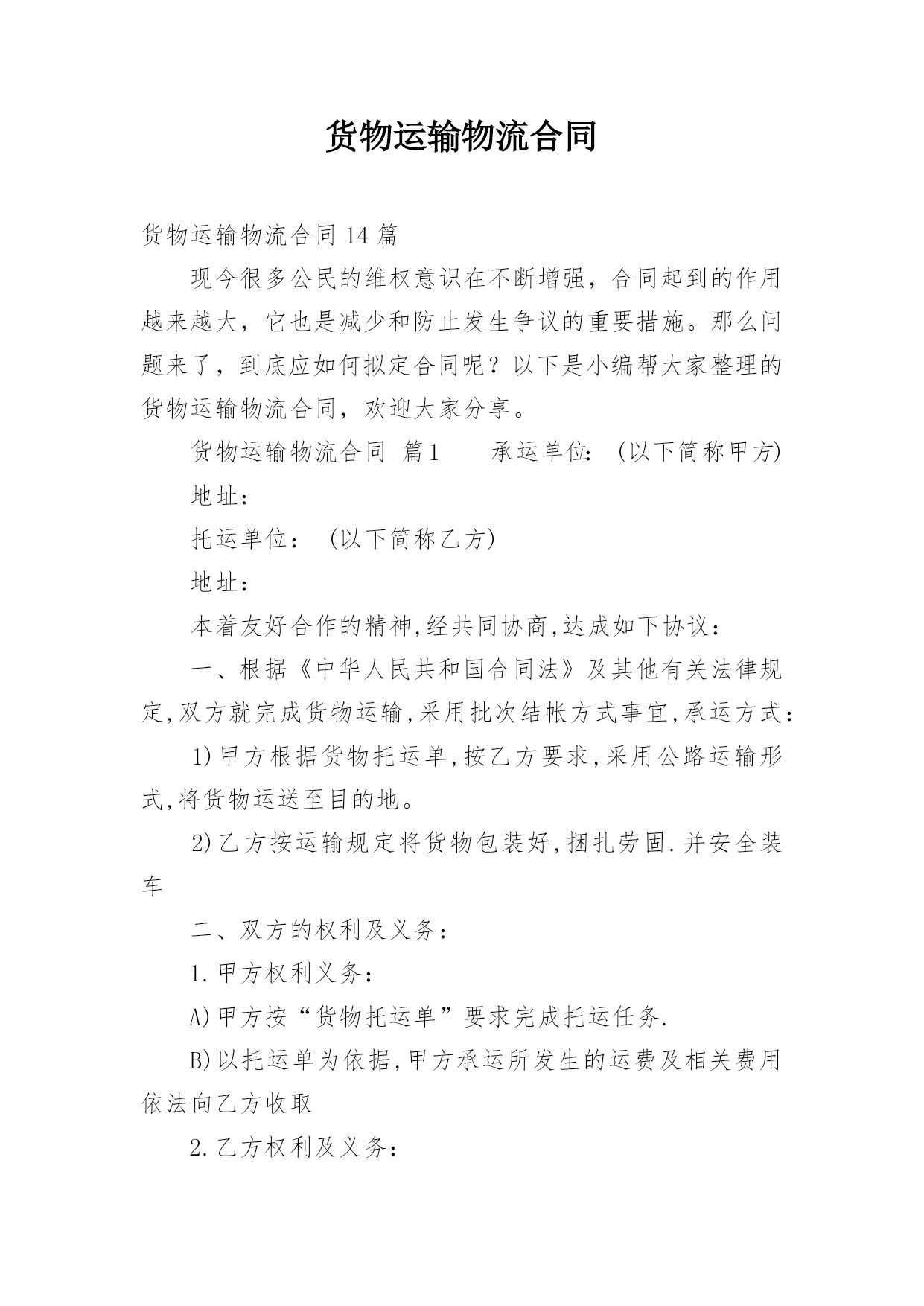 货物运输物流合同货物运输物流合同14篇现今很多公民的维权意识在不断增强,合同起到的作用越来越大,它也是减少和防止发生争议的重要措施。那么问题来了,到底应如何拟定合同呢?以下是小编帮大家整理的货物运输物流合同,欢迎大家分享。货物运输物流合同篇1承运单位:(以下简称甲方)地址:托运单位:(以下简称乙方)地址:本着友好合作的精神,经共同协商,达成如下协议:一、根据《中华人民共和国合同法》及其他有关法律规定,双方就完成货物运输,采用批次结帐方式事宜,承运方式:1)甲方根据货物托运单,按乙方要求,采用公路运输形式,