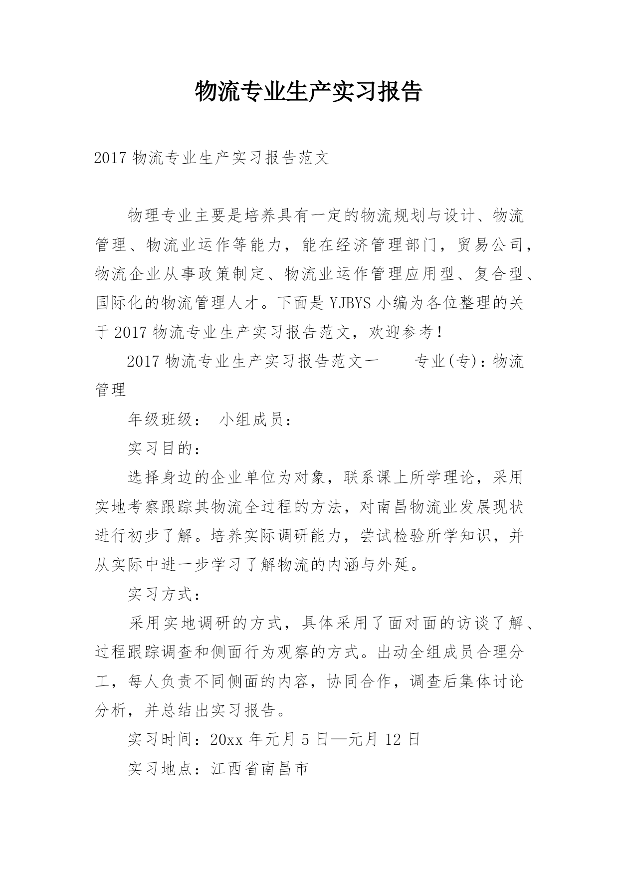 物流专业生产实习报告2017物流专业生产实习报告范文物理专业主要是培养具有一定的物流规划与设计、物流管理、物流业运作等能力,能在经济管理部门,贸易公司,物流企业从事政策制定、物流业运作管理应用型、复合型、国际化的物流管理人才。下面是YJBYS小编为各位整理的关于2017物流专业生产实习报告范文,欢迎参考!2017物流专业生产实习报告范文一专业(专):物流管理年级班级:小组成员:实习目的:选择身边的企业单位为对象,联系课上所学理论,采用实地考察跟踪其物流全过程的方法,对南昌物流业发展现状进行初步了解。培养实