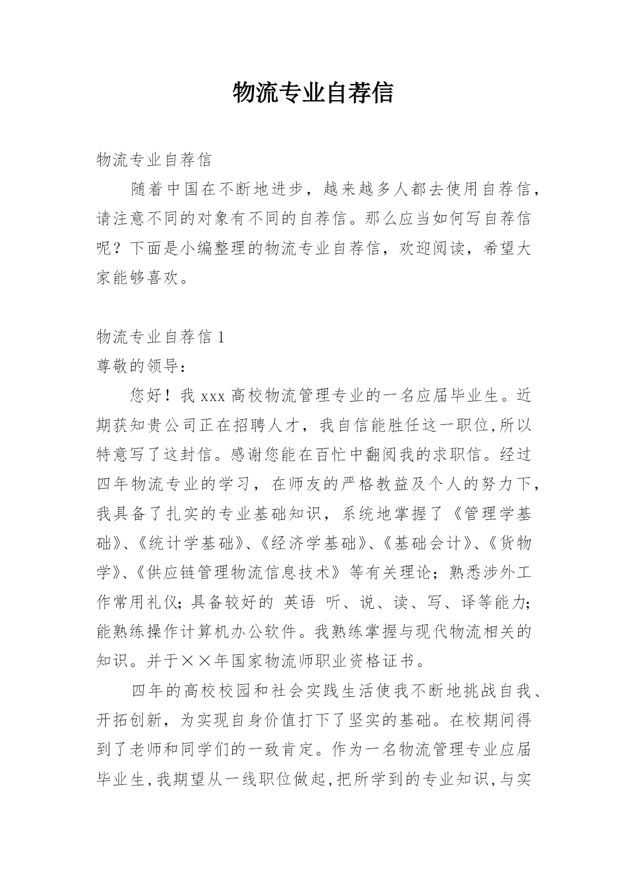 物流专业自荐信物流专业自荐信随着中国在不断地进步,越来越多人都去使用自荐信,请注意不同的对象有不同的自荐信。那么应当如何写自荐信呢?下面是小编整理的物流专业自荐信,欢迎阅读,希望大家能够喜欢。物流专业自荐信1尊敬的领导:您好!我xxx高校物流管理专业的一名应届毕业生。近期获知贵公司正在招聘人才,我自信能胜任这一职位,所以特意写了这封信。感谢您能在百忙中翻阅我的求职信。经过四年物流专业的学习,在师友的严格教益及个人的努力下,我具备了扎实的专业基础知识,系统地掌握了《管理学基础》、《统计学基础》、《经济学基础