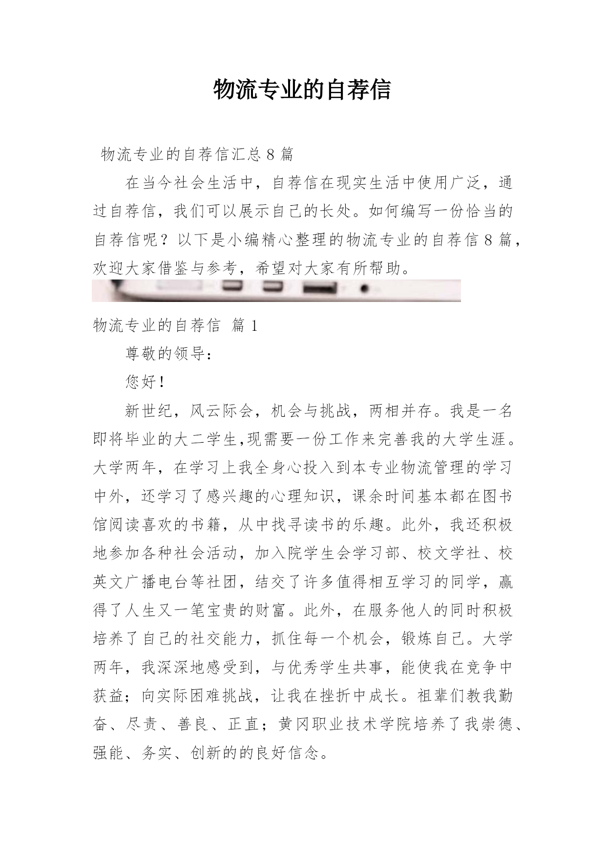 物流专业的自荐信物流专业的自荐信汇总8篇在当今社会生活中,自荐信在现实生活中使用广泛,通过自荐信,我们可以展示自己的长处。如何编写一份恰当的自荐信呢?以下是小编精心整理的物流专业的自荐信8篇,欢迎大家借鉴与参考,希望对大家有所帮助。物流专业的自荐信篇1尊敬的领导:您好!新世纪,风云际会,机会与挑战,两相并存。我是一名即将毕业的大二学生,现需要一份工作来完善我的大学生涯。大学两年,在学习上我全身心投入到本专业物流管理的学习中外,还学习了感兴趣的心理知识,课余时间基本都在图书馆阅读喜欢的书籍,从中找寻读书的乐
