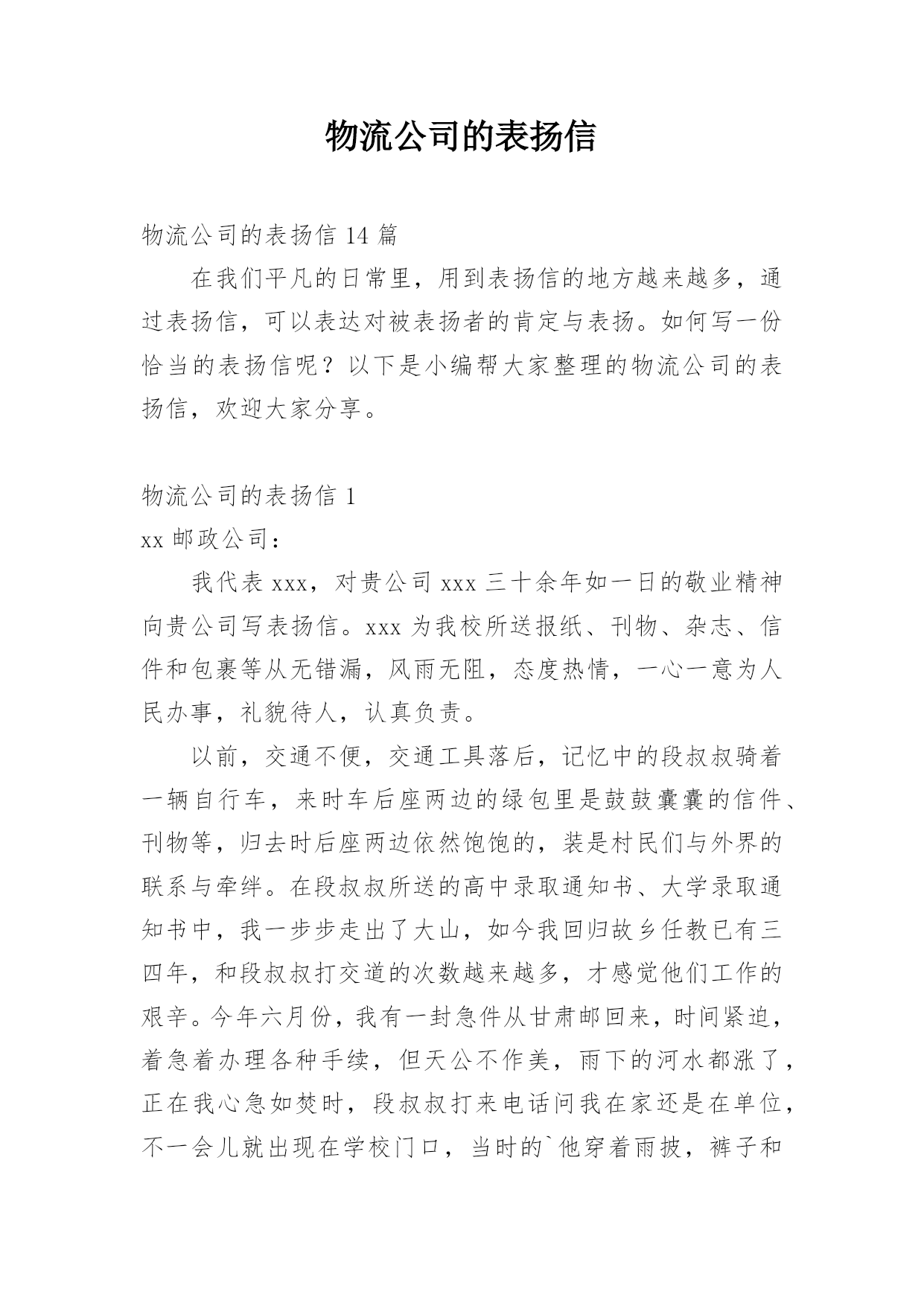 物流公司的表扬信物流公司的表扬信14篇在我们平凡的日常里,用到表扬信的地方越来越多,通过表扬信,可以表达对被表扬者的肯定与表扬。如何写一份恰当的表扬信呢?以下是小编帮大家整理的物流公司的表扬信,欢迎大家分享。物流公司的表扬信1xx邮政公司:我代表xxx,对贵公司xxx三十余年如一日的敬业精神向贵公司写表扬信。xxx为我校所送报纸、刊物、杂志、信件和包裹等从无错漏,风雨无阻,态度热情,一心一意为人民办事,礼貌待人,认真负责。以前,交通不便,交通工具落后,记忆中的段叔叔骑着一辆自行车,来时车后座两边的绿包里是