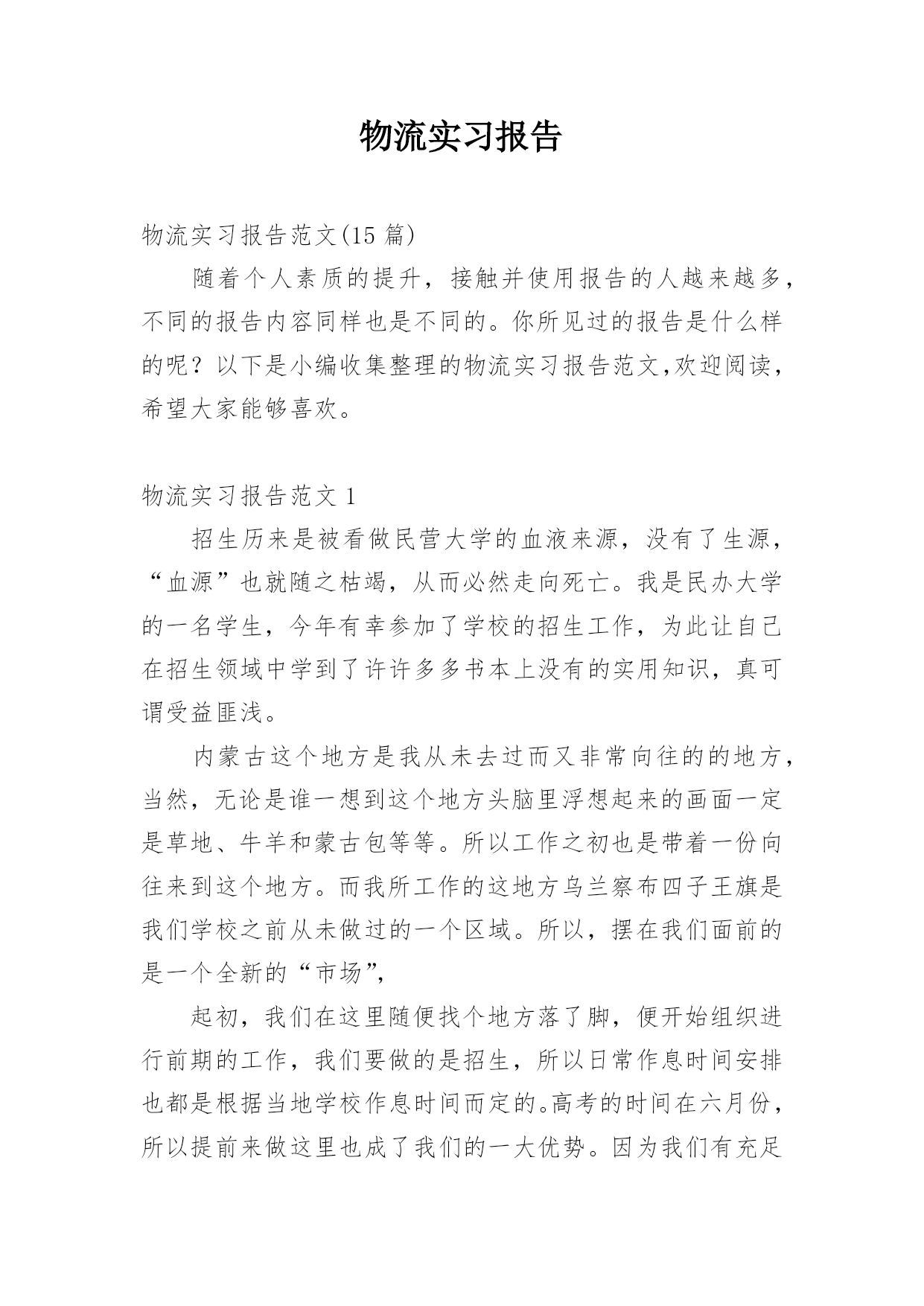 物流实习报告物流实习报告范文(15篇)随着个人素质的提升,接触并使用报告的人越来越多,不同的报告内容同样也是不同的。你所见过的报告是什么样的呢?以下是小编收集整理的物流实习报告范文,欢迎阅读,希望大家能够喜欢。物流实习报告范文1招生历来是被看做民营大学的血液来源,没有了生源,“血源”也就随之枯竭,从而必然走向死亡。我是民办大学的一名学生,今年有幸参加了学校的招生工作,为此让自己在招生领域中学到了许许多多书本上没有的实用知识,真可谓受益匪浅。内蒙古这个地方是我从未去过而又非常向往的的地方,当然,无论是谁一想