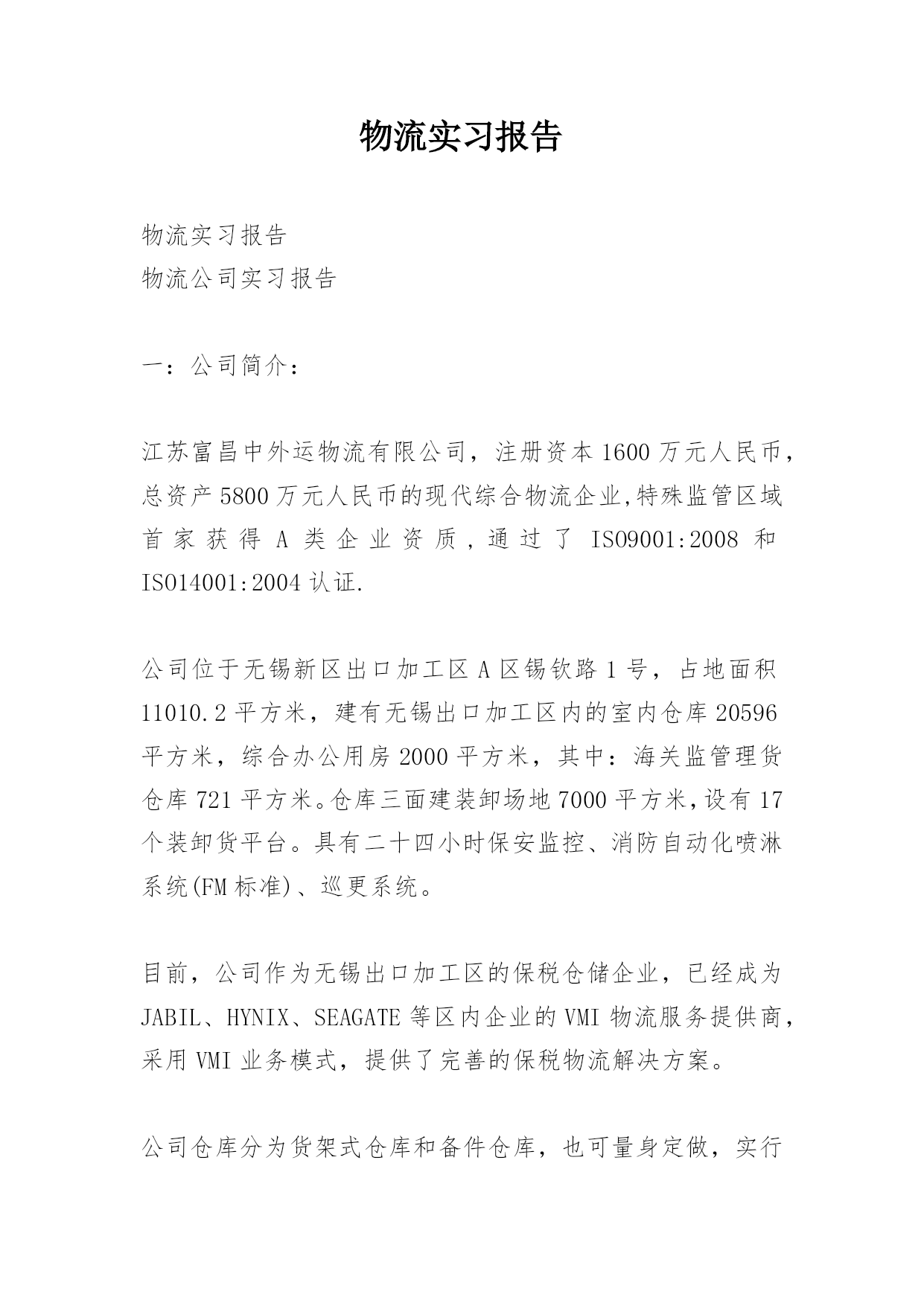 物流实习报告物流实习报告物流公司实习报告一:公司简介:江苏富昌中外运物流有限公司,注册资本1600万元人民币,总资产5800万元人民币的现代综合物流企业,特殊监管区域首家获得A类企业资质,通过了ISO9001:2008和ISO14001:2004认证.公司位于无锡新区出口加工区A区锡钦路1号,占地面积11010.2平方米,建有无锡出口加工区内的室内仓库20596平方米,综合办公用房2000平方米,其中:海关监管理货仓库721平方米。仓库三面建装卸场地7000平方米,设有17个装卸货平台。具有二十四小时保安