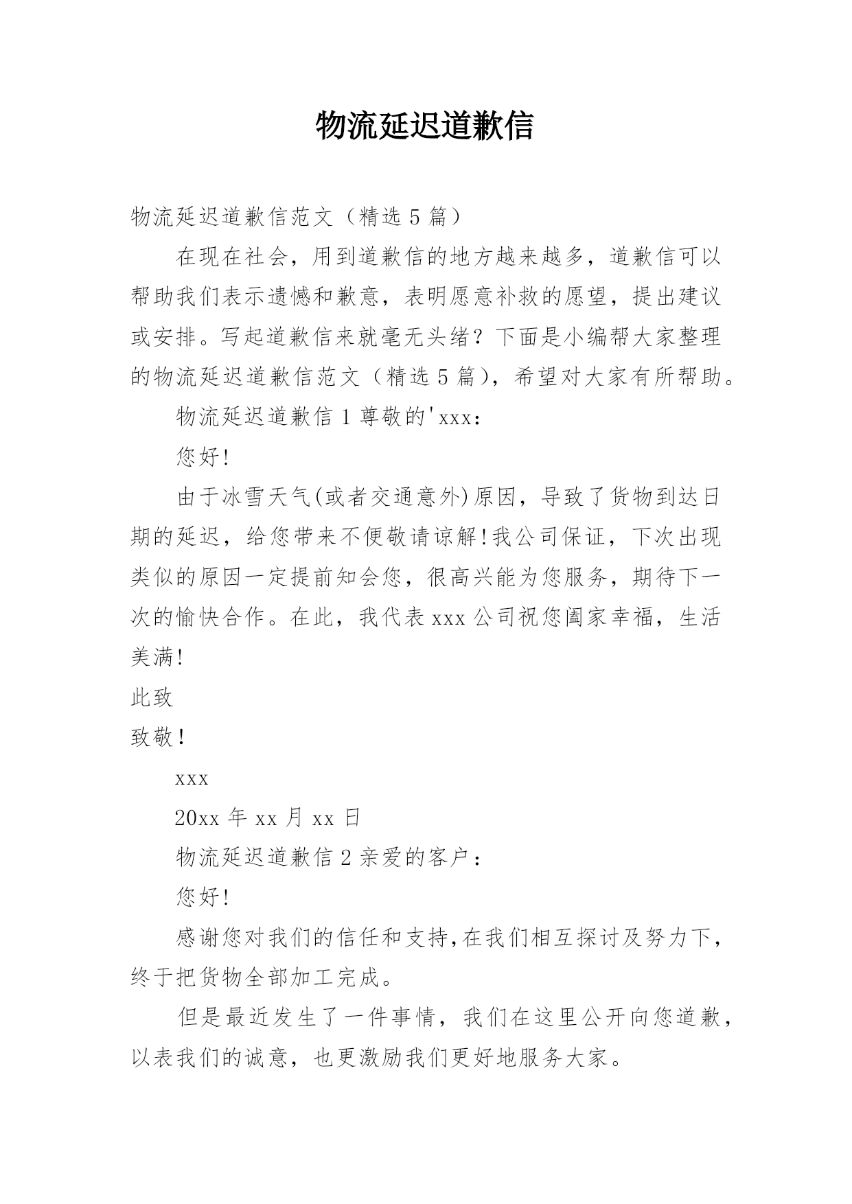 物流延迟道歉信物流延迟道歉信范文(精选5篇)在现在社会,用到道歉信的地方越来越多,道歉信可以帮助我们表示遗憾和歉意,表明愿意补救的愿望,提出建议或安排。写起道歉信来就毫无头绪?下面是小编帮大家整理的物流延迟道歉信范文(精选5篇),希望对大家有所帮助。物流延迟道歉信1尊敬的'xxx:您好!由于冰雪天气(或者交通意外)原因,导致了货物到达日期的延迟,给您带来不便敬请谅解!我公司保证,下次出现类似的原因一定提前知会您,很高兴能为您服务,期待下一次的愉快合作。在此,我代表xxx公司祝您阖家幸福,生活美满!此致致敬