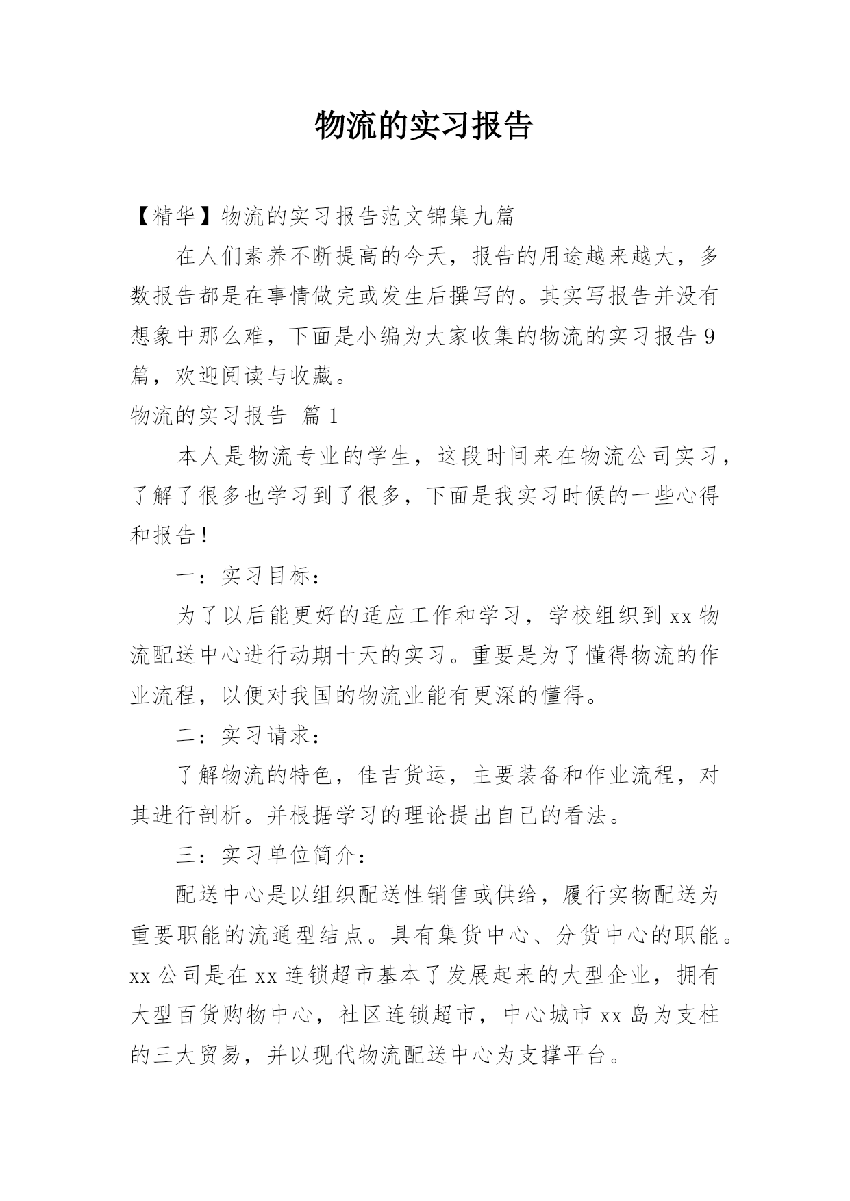 物流的实习报告【精华】物流的实习报告范文锦集九篇在人们素养不断提高的今天,报告的用途越来越大,多数报告都是在事情做完或发生后撰写的。其实写报告并没有想象中那么难,下面是小编为大家收集的物流的实习报告9篇,欢迎阅读与收藏。物流的实习报告篇1本人是物流专业的学生,这段时间来在物流公司实习,了解了很多也学习到了很多,下面是我实习时候的一些心得和报告!一:实习目标:为了以后能更好的适应工作和学习,学校组织到xx物流配送中心进行动期十天的实习。重要是为了懂得物流的作业流程,以便对我国的物流业能有更深的懂得。二:实习
