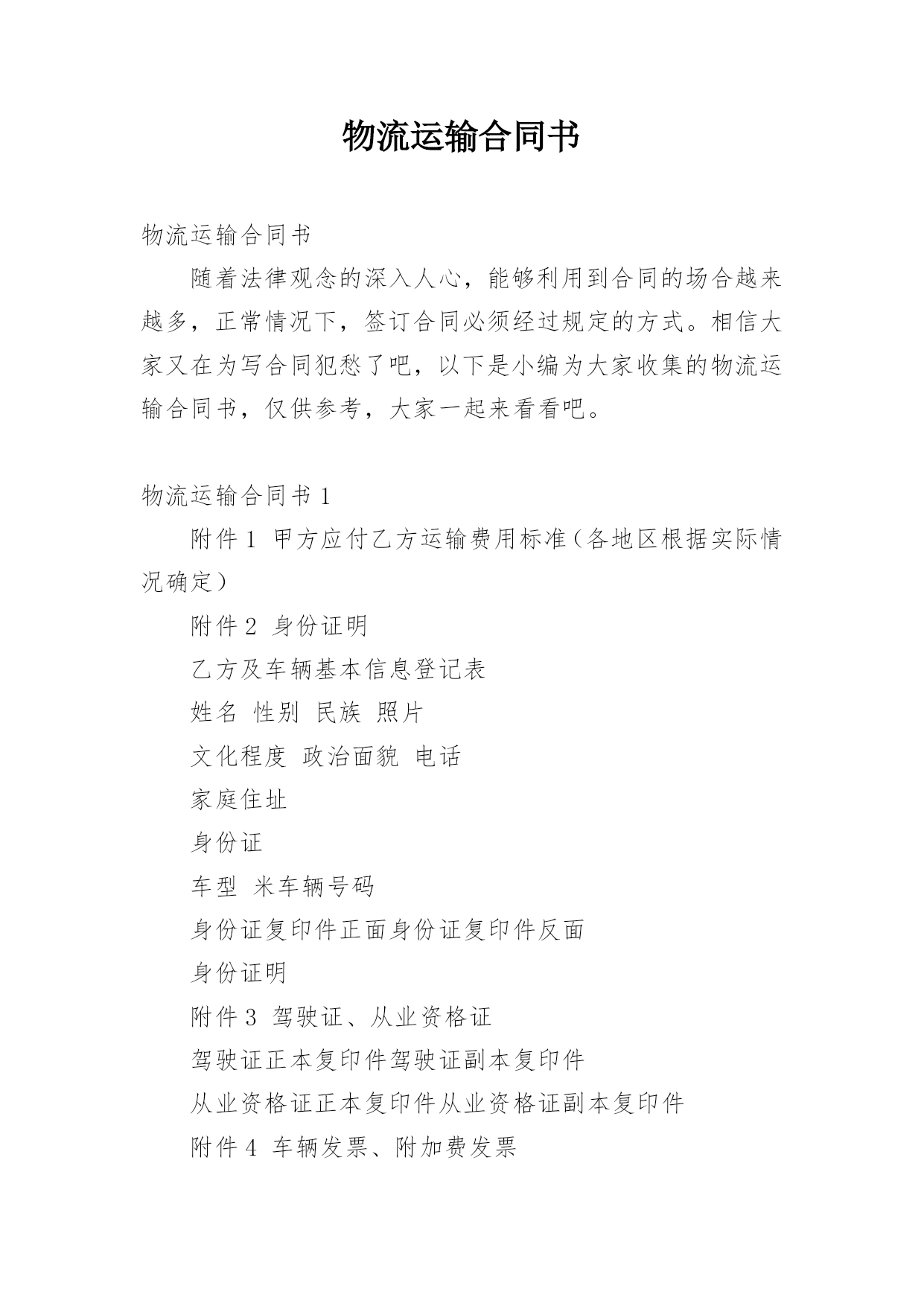 物流运输合同书物流运输合同书随着法律观念的深入人心,能够利用到合同的场合越来越多,正常情况下,签订合同必须经过规定的方式。相信大家又在为写合同犯愁了吧,以下是小编为大家收集的物流运输合同书,仅供参考,大家一起来看看吧。物流运输合同书1附件1甲方应付乙方运输费用标准(各地区根据实际情况确定)附件2身份证明乙方及车辆基本信息登记表姓名性别民族照片文化程度政治面貌电话家庭住址身份证车型米车辆号码身份证复印件正面身份证复印件反面身份证明附件3驾驶证、从业资格证驾驶证正本复印件驾驶证副本复印件从业资格证正本复印件从