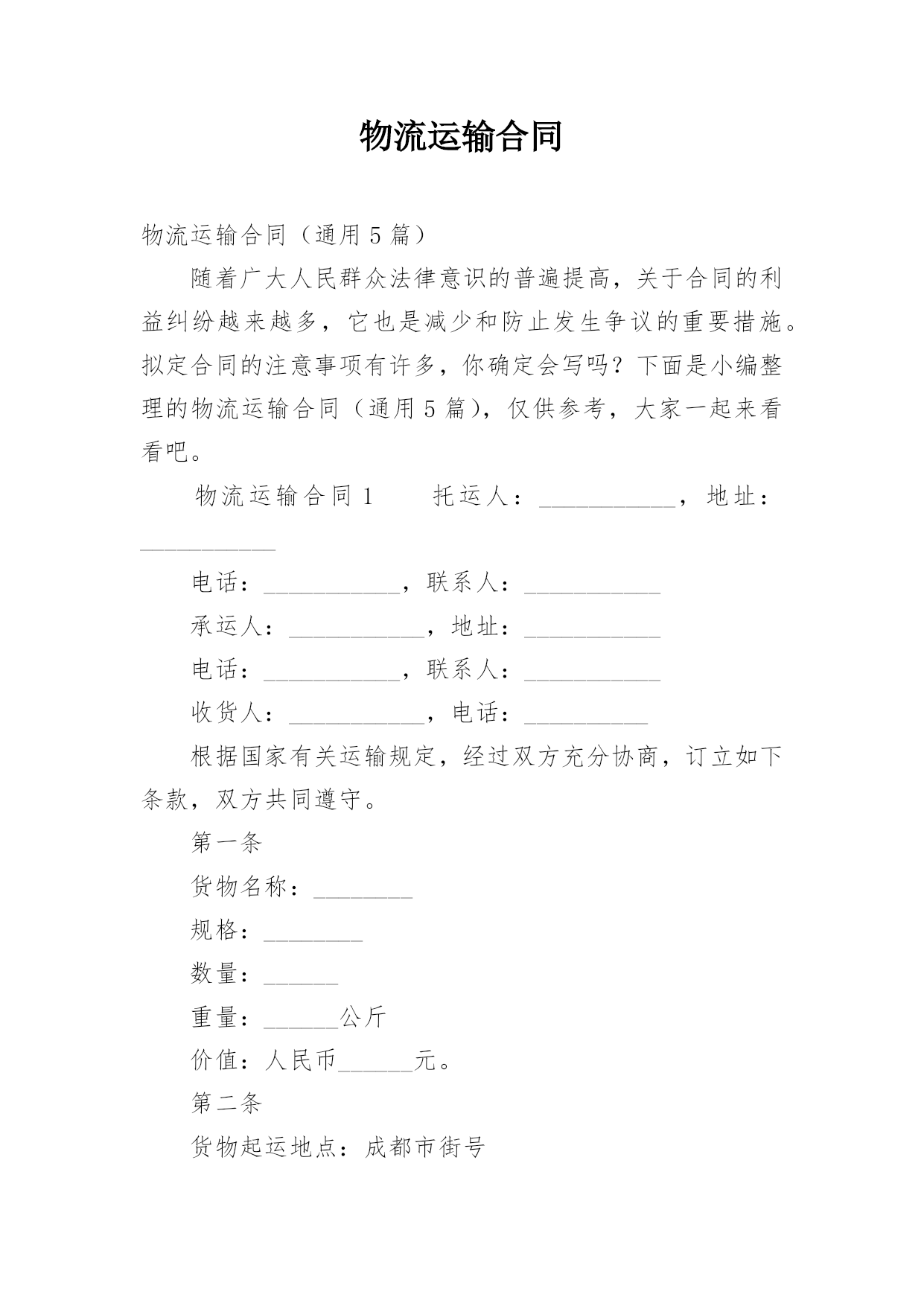 物流运输合同物流运输合同(通用5篇)随着广大人民群众法律意识的普遍提高,关于合同的利益纠纷越来越多,它也是减少和防止发生争议的重要措施。拟定合同的注意事项有许多,你确定会写吗?下面是小编整理的物流运输合同(通用5篇),仅供参考,大家一起来看看吧。物流运输合同1托运人:___________,地址:___________电话:___________,联系人:___________承运人:___________,地址:___________电话:___________,联系人:___________收货人:_