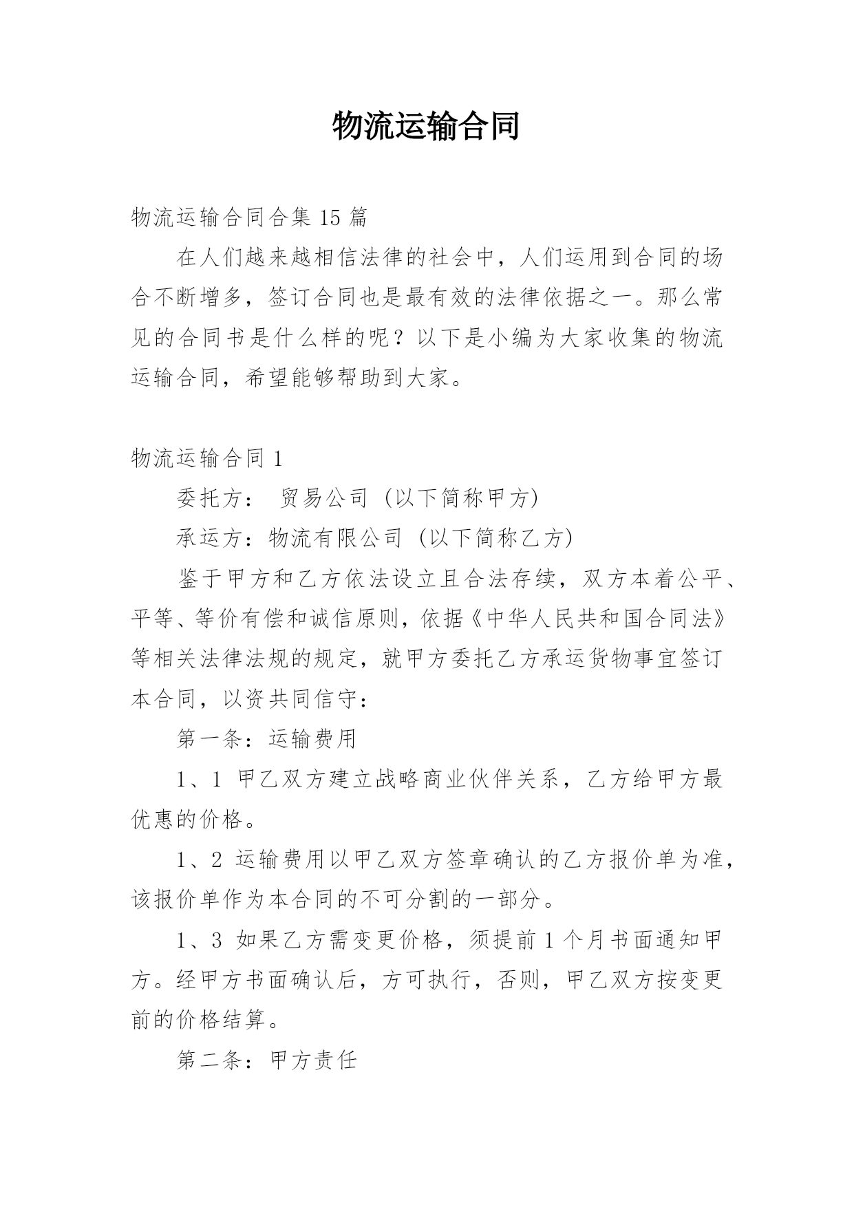 物流运输合同物流运输合同合集15篇在人们越来越相信法律的社会中,人们运用到合同的场合不断增多,签订合同也是最有效的法律依据之一。那么常见的合同书是什么样的呢?以下是小编为大家收集的物流运输合同,希望能够帮助到大家。物流运输合同1委托方:贸易公司(以下简称甲方)承运方:物流有限公司(以下简称乙方)鉴于甲方和乙方依法设立且合法存续,双方本着公平、平等、等价有偿和诚信原则,依据《中华人民共和国合同法》等相关法律法规的规定,就甲方委托乙方承运货物事宜签订本合同,以资共同信守:第一条:运输费用1、1甲乙双方建立战略