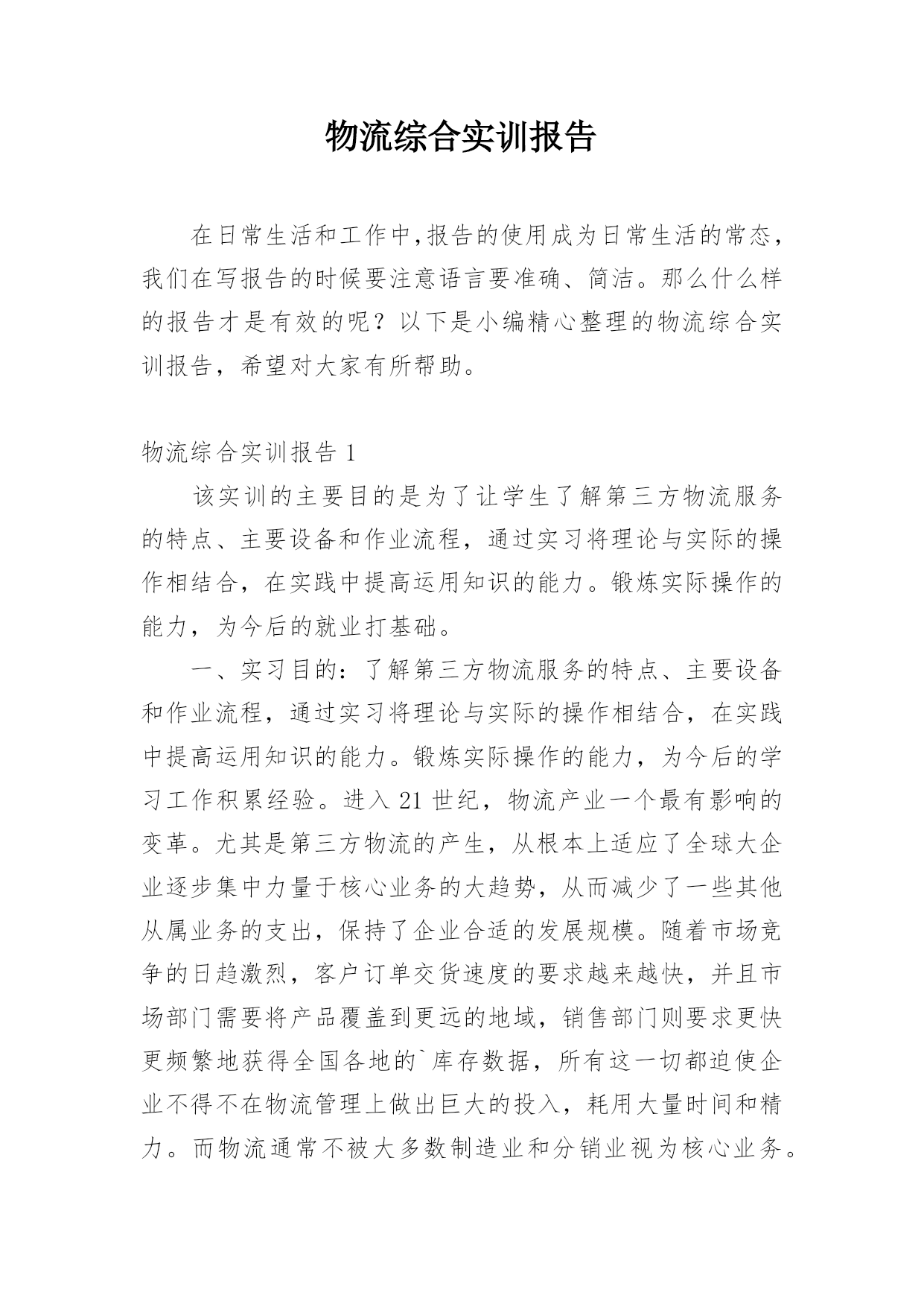 物流综合实训报告在日常生活和工作中,报告的使用成为日常生活的常态,我们在写报告的时候要注意语言要准确、简洁。那么什么样的报告才是有效的呢?以下是小编精心整理的物流综合实训报告,希望对大家有所帮助。物流综合实训报告1该实训的主要目的是为了让学生了解第三方物流服务的特点、主要设备和作业流程,通过实习将理论与实际的操作相结合,在实践中提高运用知识的能力。锻炼实际操作的能力,为今后的就业打基础。一、实习目的:了解第三方物流服务的特点、主要设备和作业流程,通过实习将理论与实际的操作相结合,在实践中提高运用知识的能力