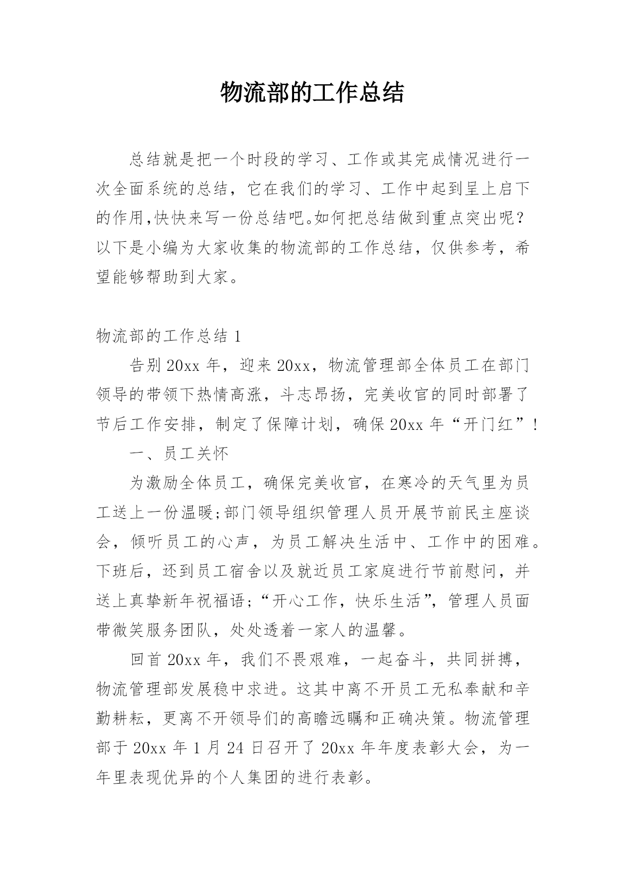 物流部的工作总结总结就是把一个时段的学习、工作或其完成情况进行一次全面系统的总结,它在我们的学习、工作中起到呈上启下的作用,快快来写一份总结吧。如何把总结做到重点突出呢?以下是小编为大家收集的物流部的工作总结,仅供参考,希望能够帮助到大家。物流部的工作总结1告别20xx年,迎来20xx,物流管理部全体员工在部门领导的带领下热情高涨,斗志昂扬,完美收官的同时部署了节后工作安排,制定了保障计划,确保20xx年“开门红”!一、员工关怀为激励全体员工,确保完美收官,在寒冷的天气里为员工送上一份温暖;部门领导组织管