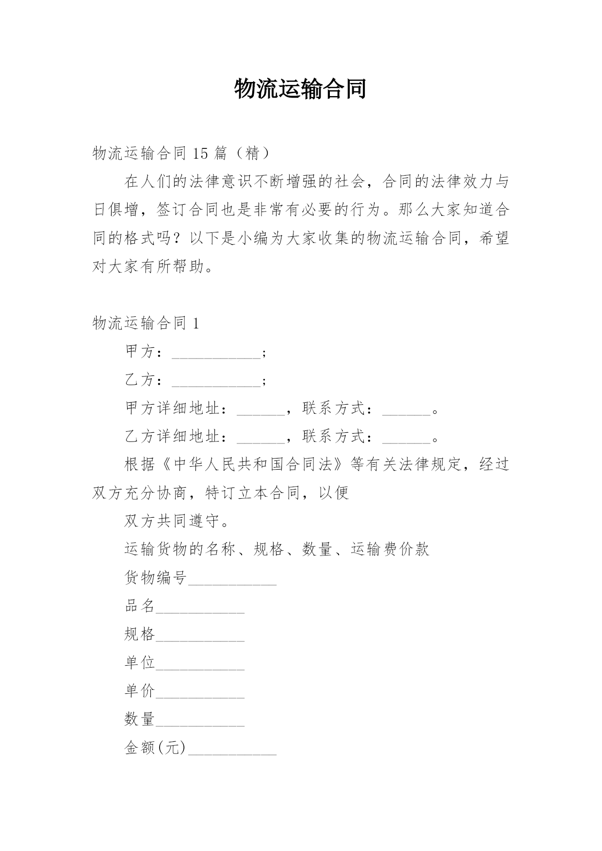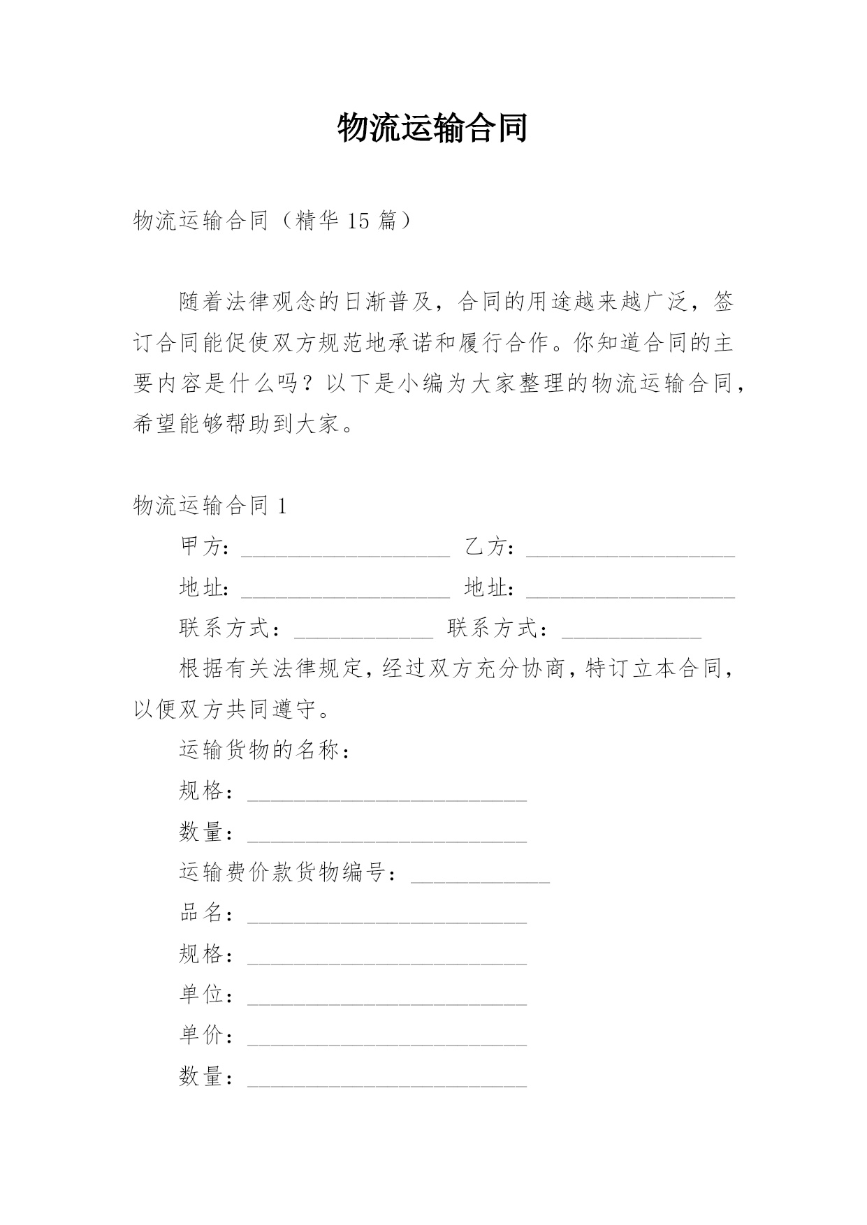 物流运输合同物流运输合同(精华15篇)随着法律观念的日渐普及,合同的用途越来越广泛,签订合同能促使双方规范地承诺和履行合作。你知道合同的主要内容是什么吗?以下是小编为大家整理的物流运输合同,希望能够帮助到大家。物流运输合同1甲方:__________________乙方:__________________地址:__________________地址:__________________联系方式:____________联系方式:____________根据有关法律规定,经过双方充分协商,特订立本合同,