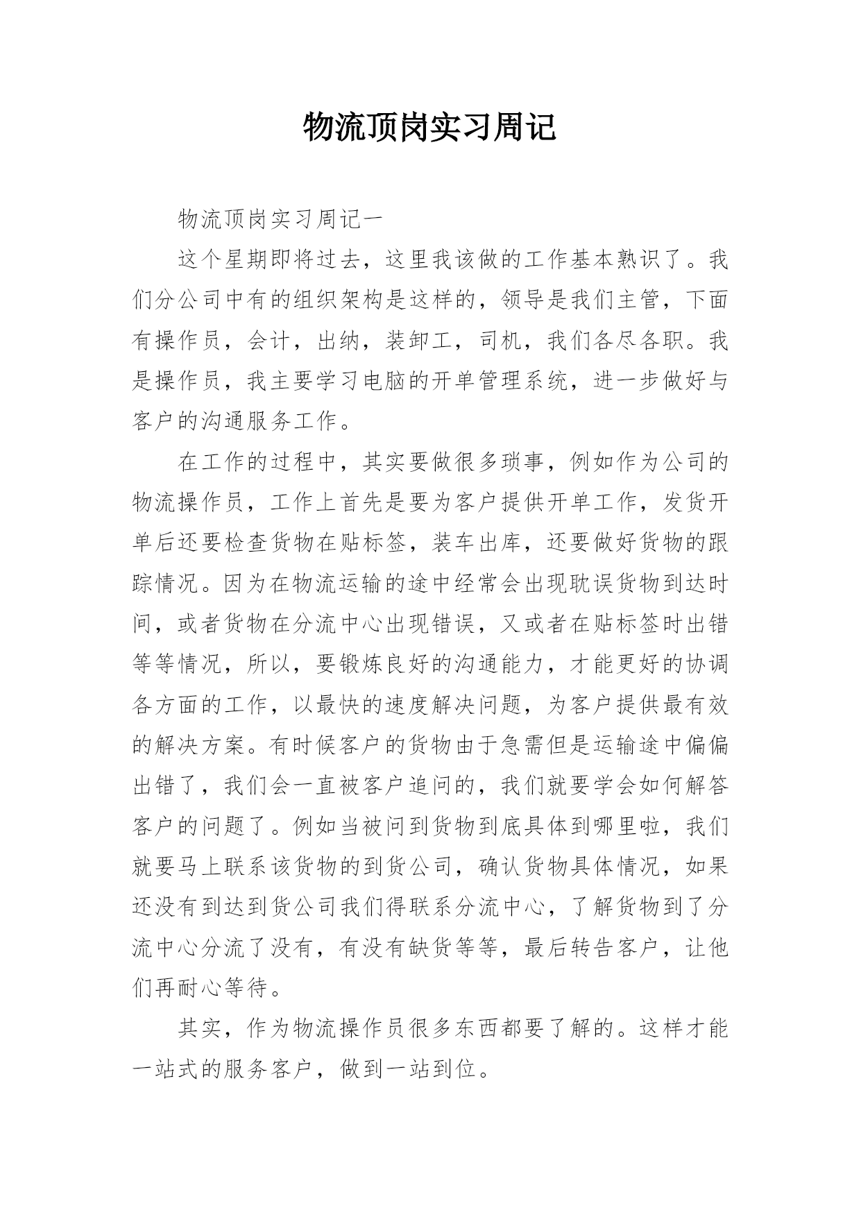 物流顶岗实习周记物流顶岗实习周记一这个星期即将过去,这里我该做的工作基本熟识了。我们分公司中有的组织架构是这样的,领导是我们主管,下面有操作员,会计,出纳,装卸工,司机,我们各尽各职。我是操作员,我主要学习电脑的开单管理系统,进一步做好与客户的沟通服务工作。在工作的过程中,其实要做很多琐事,例如作为公司的物流操作员,工作上首先是要为客户提供开单工作,发货开单后还要检查货物在贴标签,装车出库,还要做好货物的跟踪情况。因为在物流运输的途中经常会出现耽误货物到达时间,或者货物在分流中心出现错误,又或者在贴标签时