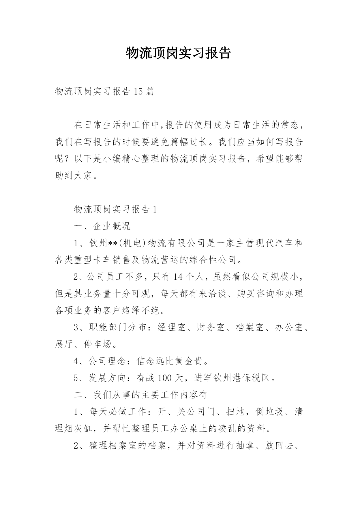 物流顶岗实习报告物流顶岗实习报告15篇在日常生活和工作中,报告的使用成为日常生活的常态,我们在写报告的时候要避免篇幅过长。我们应当如何写报告呢?以下是小编精心整理的物流顶岗实习报告,希望能够帮助到大家。物流顶岗实习报告1一、企业概况1、钦州**(机电)物流有限公司是一家主营现代汽车和各类重型卡车销售及物流营运的综合性公司。2、公司员工不多,只有14个人,虽然看似公司规模小,但是其业务量十分可观,每天都有来洽谈、购买咨询和办理各项业务的客户络绎不绝。3、职能部门分布:经理室、财务室、档案室、办公室、展厅、停