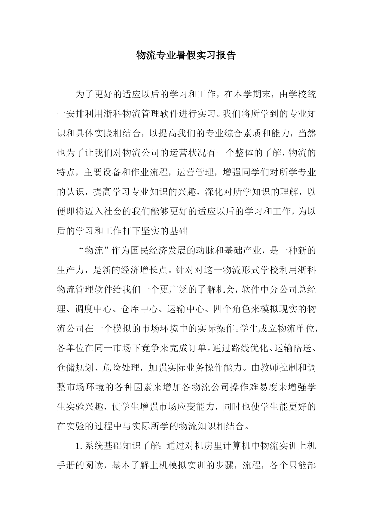 物流专业暑假实习报告为了更好的适应以后的学习和工作,在本学期末,由学校统一安排利用浙科物流管理软件进行实习。我们将所学到的专业知识和具体实践相结合,以提高我们的专业综合素质和能力,当然也为了让我们对物流公司的运营状况有一个整体的了解,物流的特点,主要设备和作业流程,运营管理,增强同学们对所学专业的认识,提高学习专业知识的兴趣,深化对所学知识的理解,以便即将迈入社会的我们能够更好的适应以后的学习和工作,为以后的学习和工作打下坚实的基础“物流”作为国民经济发展的动脉和基础产业,是一种新的生产力,是新的经济增长