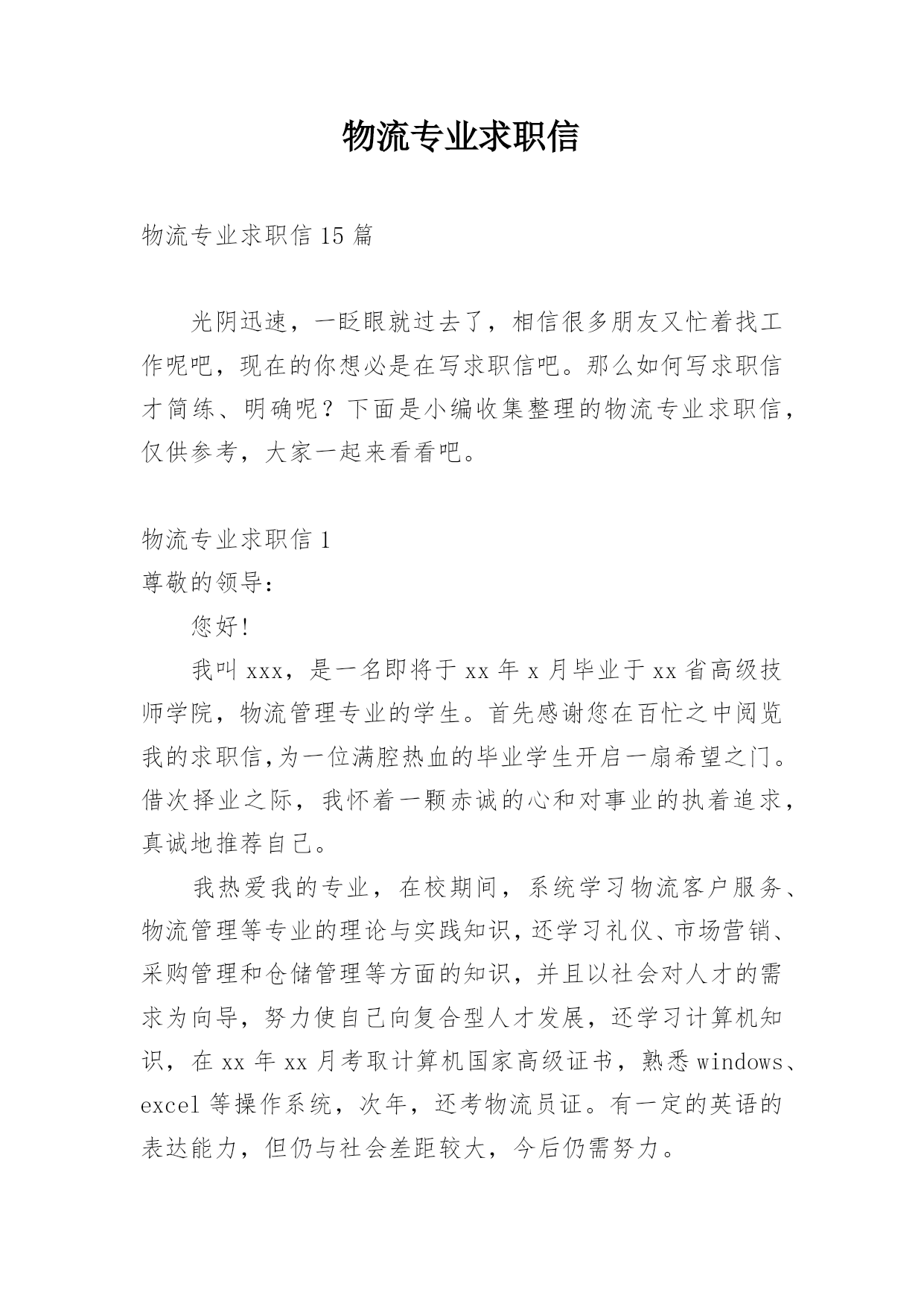物流专业求职信物流专业求职信15篇光阴迅速,一眨眼就过去了,相信很多朋友又忙着找工作呢吧,现在的你想必是在写求职信吧。那么如何写求职信才简练、明确呢?下面是小编收集整理的物流专业求职信,仅供参考,大家一起来看看吧。物流专业求职信1尊敬的领导:您好!我叫xxx,是一名即将于xx年x月毕业于xx省高级技师学院,物流管理专业的学生。首先感谢您在百忙之中阅览我的求职信,为一位满腔热血的毕业学生开启一扇希望之门。借次择业之际,我怀着一颗赤诚的心和对事业的执着追求,真诚地推荐自己。我热爱我的专业,在校期间,系统学习物