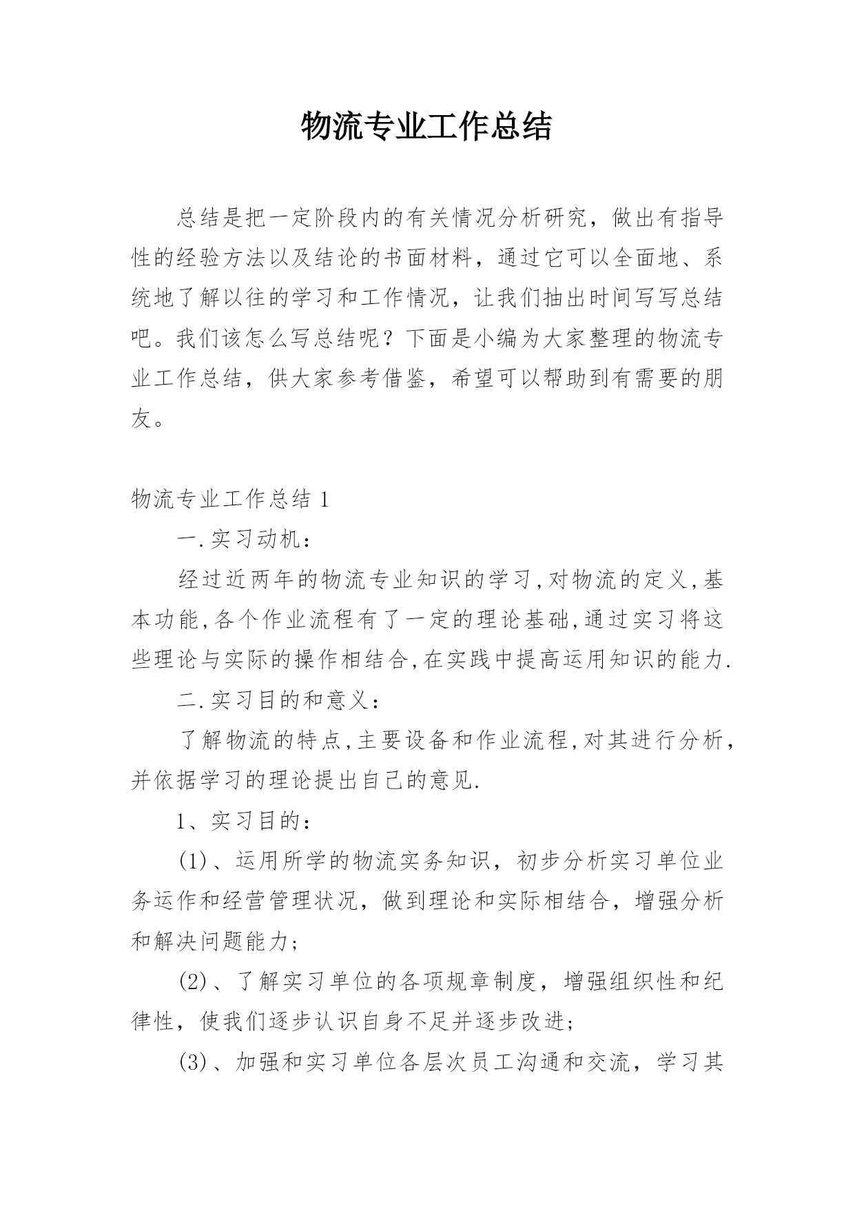 物流专业工作总结总结是把一定阶段内的有关情况分析研究,做出有指导性的经验方法以及结论的书面材料,通过它可以全面地、系统地了解以往的学习和工作情况,让我们抽出时间写写总结吧。我们该怎么写总结呢?下面是小编为大家整理的物流专业工作总结,供大家参考借鉴,希望可以帮助到有需要的朋友。物流专业工作总结1一.实习动机:经过近两年的物流专业知识的学习,对物流的定义,基本功能,各个作业流程有了一定的理论基础,通过实习将这些理论与实际的操作相结合,在实践中提高运用知识的能力.二.实习目的和意义:了解物流的特点,主要设备和作