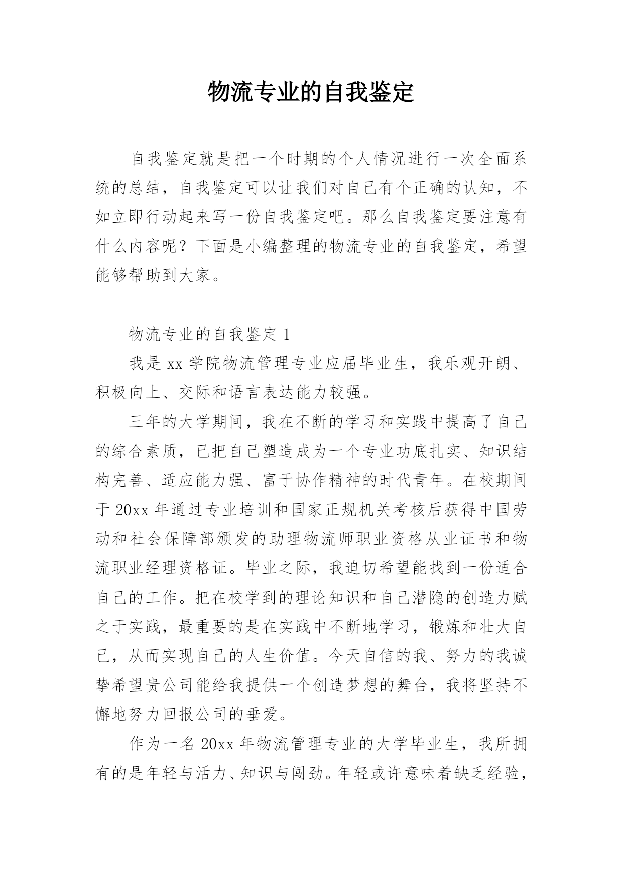 物流专业的自我鉴定自我鉴定就是把一个时期的个人情况进行一次全面系统的总结,自我鉴定可以让我们对自己有个正确的认知,不如立即行动起来写一份自我鉴定吧。那么自我鉴定要注意有什么内容呢?下面是小编整理的物流专业的自我鉴定,希望能够帮助到大家。物流专业的自我鉴定1我是xx学院物流管理专业应届毕业生,我乐观开朗、积极向上、交际和语言表达能力较强。三年的大学期间,我在不断的学习和实践中提高了自己的综合素质,已把自己塑造成为一个专业功底扎实、知识结构完善、适应能力强、富于协作精神的时代青年。在校期间于20xx年通过专业