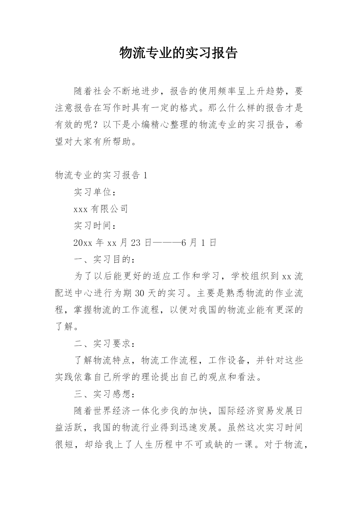 物流专业的实习报告随着社会不断地进步,报告的使用频率呈上升趋势,要注意报告在写作时具有一定的格式。那么什么样的报告才是有效的呢?以下是小编精心整理的物流专业的实习报告,希望对大家有所帮助。物流专业的实习报告1实习单位:xxx有限公司实习时间:20xx年xx月23日———6月1日一、实习目的:为了以后能更好的适应工作和学习,学校组织到xx流配送中心进行为期30天的实习。主要是熟悉物流的作业流程,掌握物流的工作流程,以便对我国的物流业能有更深的了解。二、实习要求:了解物流特点,物流工作流程,工作设备,并针对这