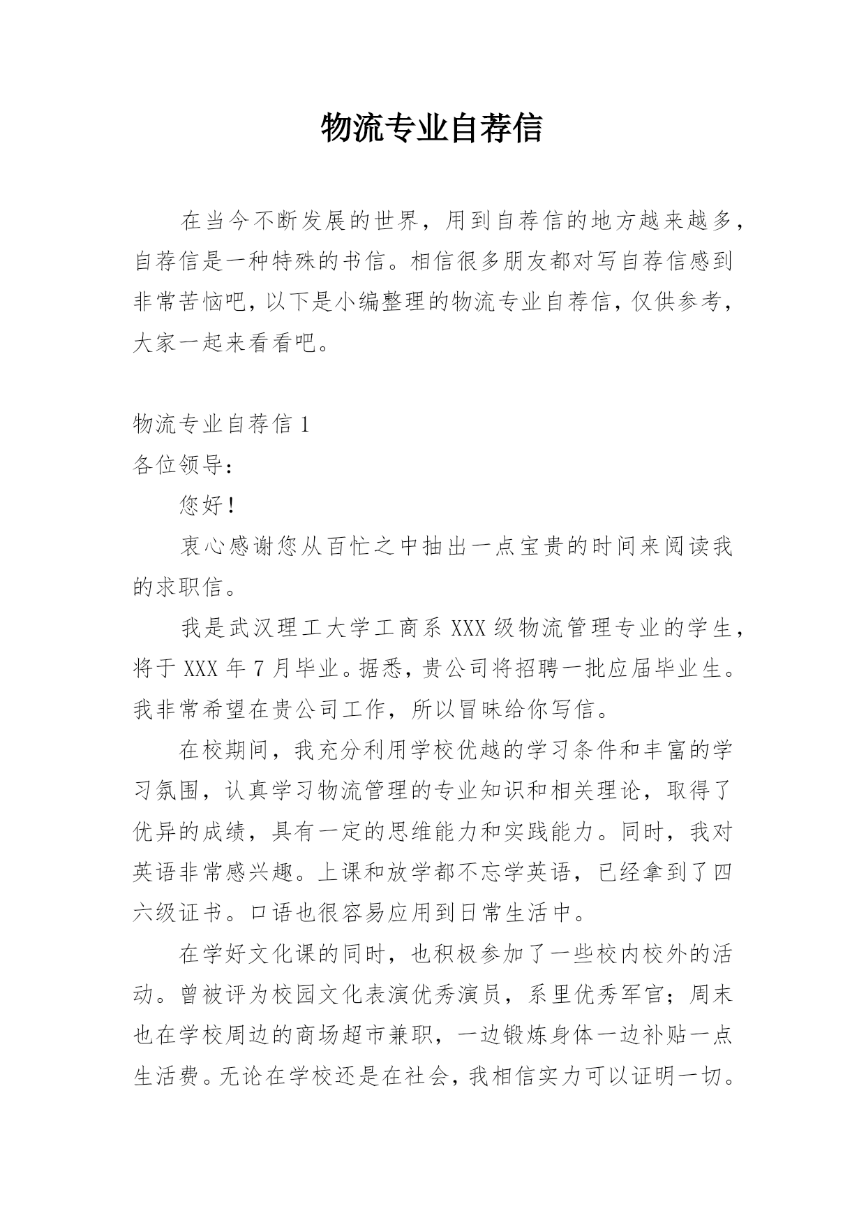 物流专业自荐信在当今不断发展的世界,用到自荐信的地方越来越多,自荐信是一种特殊的书信。相信很多朋友都对写自荐信感到非常苦恼吧,以下是小编整理的物流专业自荐信,仅供参考,大家一起来看看吧。物流专业自荐信1各位领导:您好!衷心感谢您从百忙之中抽出一点宝贵的时间来阅读我的求职信。我是武汉理工大学工商系XXX级物流管理专业的学生,将于XXX年7月毕业。据悉,贵公司将招聘一批应届毕业生。我非常希望在贵公司工作,所以冒昧给你写信。在校期间,我充分利用学校优越的学习条件和丰富的学习氛围,认真学习物流管理的专业知识和相关