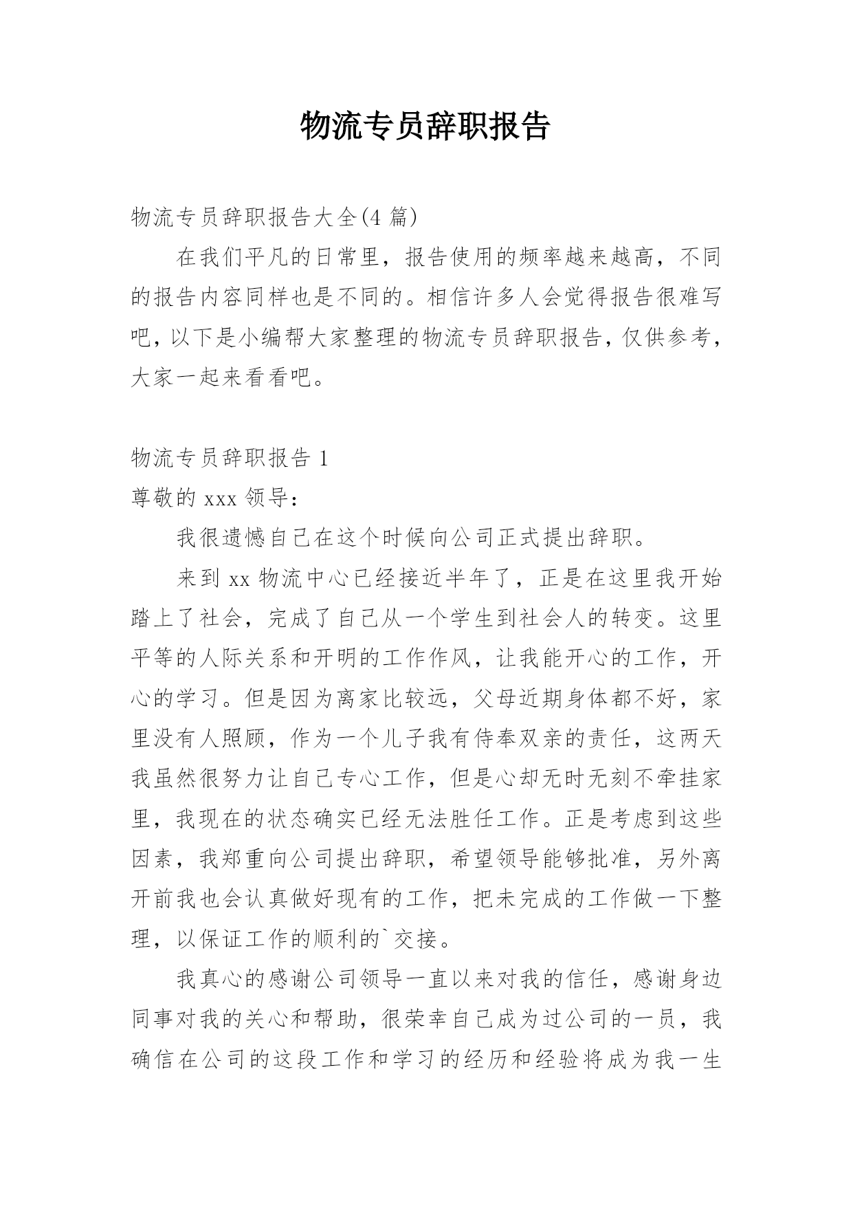 物流专员辞职报告物流专员辞职报告大全(4篇)在我们平凡的日常里,报告使用的频率越来越高,不同的报告内容同样也是不同的。相信许多人会觉得报告很难写吧,以下是小编帮大家整理的物流专员辞职报告,仅供参考,大家一起来看看吧。物流专员辞职报告1尊敬的xxx领导:我很遗憾自己在这个时候向公司正式提出辞职。来到xx物流中心已经接近半年了,正是在这里我开始踏上了社会,完成了自己从一个学生到社会人的转变。这里平等的人际关系和开明的工作作风,让我能开心的工作,开心的学习。但是因为离家比较远,父母近期身体都不好,家里没有人照顾