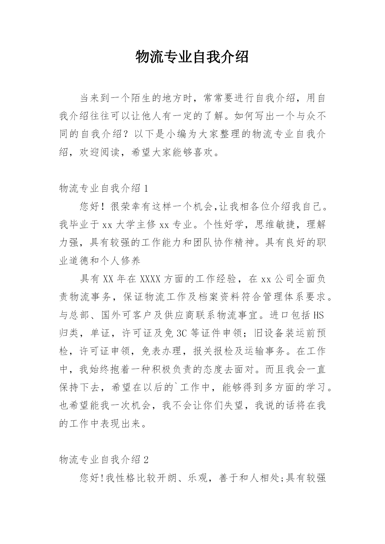 物流专业自我介绍当来到一个陌生的地方时,常常要进行自我介绍,用自我介绍往往可以让他人有一定的了解。如何写出一个与众不同的自我介绍?以下是小编为大家整理的物流专业自我介绍,欢迎阅读,希望大家能够喜欢。物流专业自我介绍1您好!很荣幸有这样一个机会,让我相各位介绍我自己。我毕业于xx大学主修xx专业。个性好学,思维敏捷,理解力强,具有较强的工作能力和团队协作精神。具有良好的职业道德和个人修养具有XX年在XXXX方面的工作经验,在xx公司全面负责物流事务,保证物流工作及档案资料符合管理体系要求。与总部、国外可客户