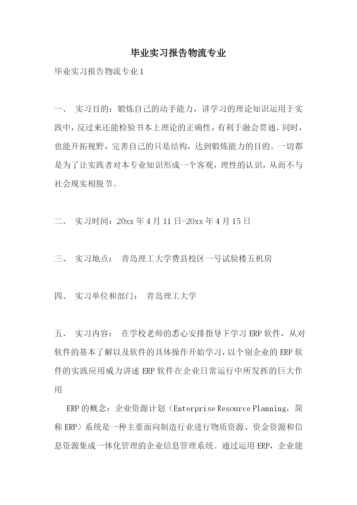 毕业实习报告物流专业毕业实习报告物流专业1一、实习目的:锻炼自己的动手能力,讲学习的理论知识运用于实践中,反过来还能检验书本上理论的正确性,有利于融会贯通。同时,也能开拓视野,完善自己的只是结构,达到锻炼能力的目的。一切都是为了让实践者对本专业知识形成一个客观,理性的认识,从而不与社会现实相脱节。二、实习时间:20xx年4月11日-20xx年4月15日三、实习地点:青岛理工大学费县校区一号试验楼五机房四、实习单位和部门:青岛理工大学五、实习内容:在学校老师的悉心安排指导下学习ERP软件,从对软件的基本了解