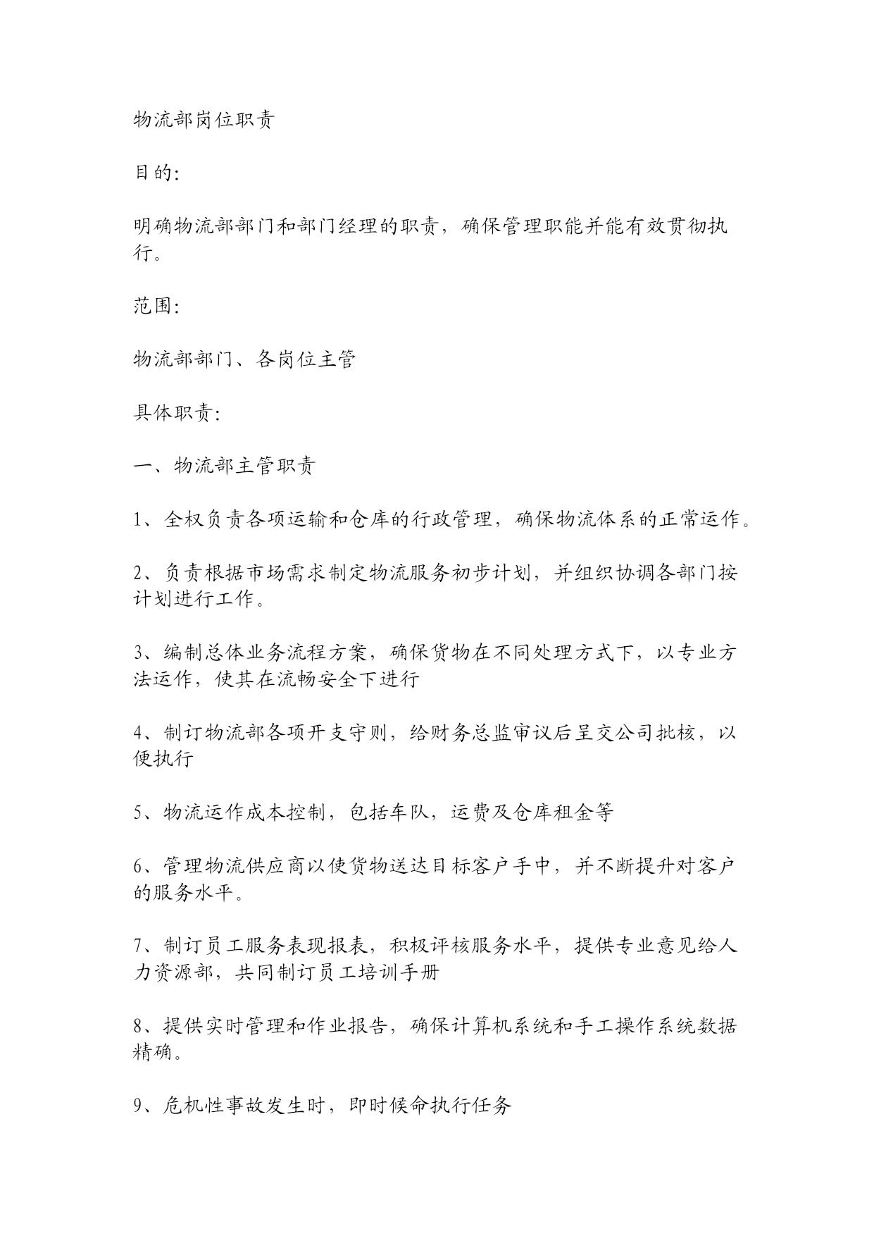 物流部岗位职责目的:明确物流部部门和部门经理的职责,确保管理职能并能有效贯彻执行。范围:物流部部门、各岗位主管具体职责:一、物流部主管职责1、全权负责各项运输和仓库的行政管理,确保物流体系的正常运作。2、负责根据市场需求制定物流服务初步计划,并组织协调各部门按计划进行工作。3、编制总体业务流程方案,确保货物在不同处理方式下,以专业方法运作,使其在流畅安全下进行4、制订物流部各项开支守则,给财务总监审议后呈交公司批核,以便执行5、物流运作成本控制,包括车队,运费及仓库租金等6、管理物流供应商以使货物送达目标