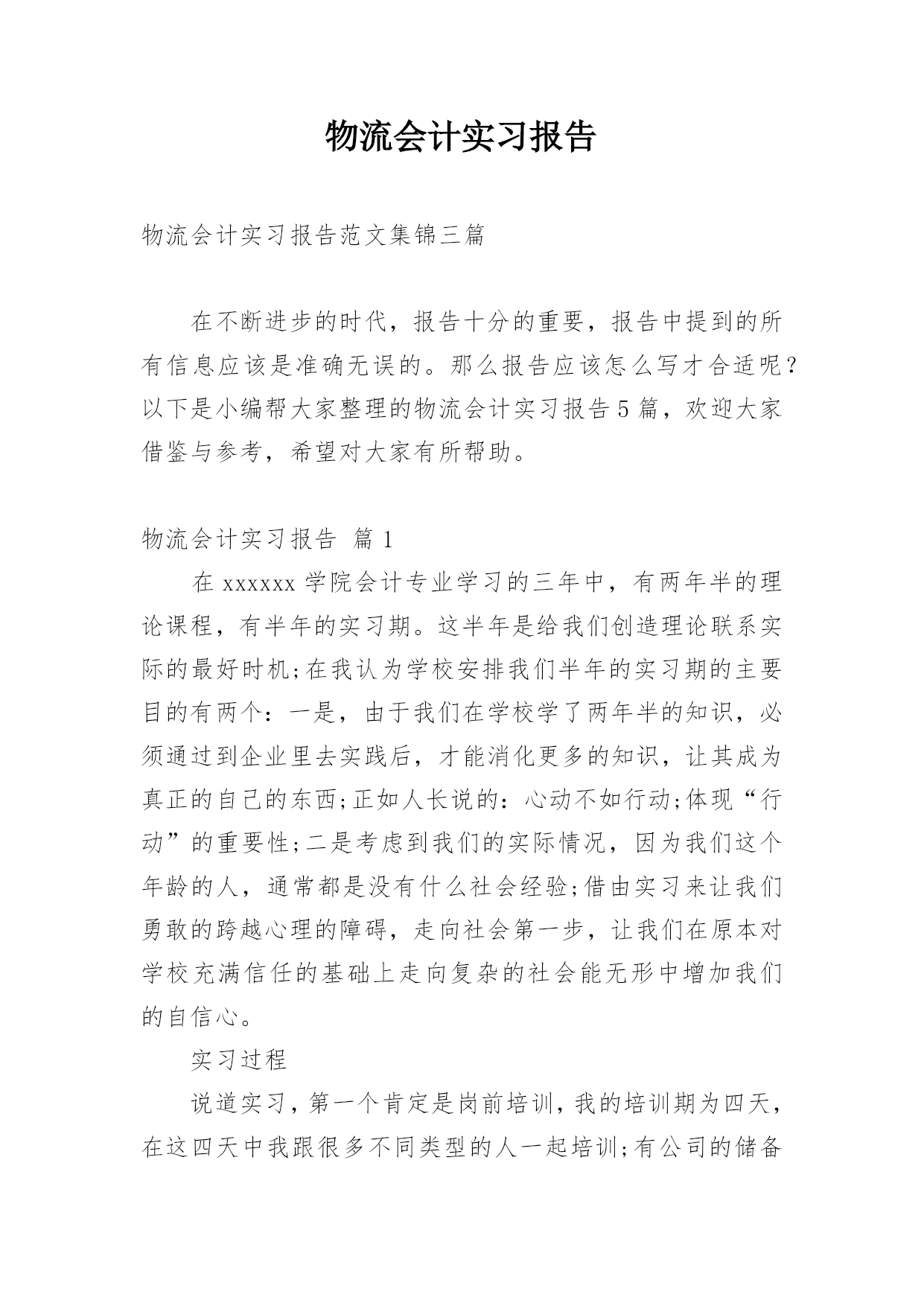 物流会计实习报告物流会计实习报告范文集锦三篇在不断进步的时代,报告十分的重要,报告中提到的所有信息应该是准确无误的。那么报告应该怎么写才合适呢?以下是小编帮大家整理的物流会计实习报告5篇,欢迎大家借鉴与参考,希望对大家有所帮助。物流会计实习报告篇1在xxxxxx学院会计专业学习的三年中,有两年半的理论课程,有半年的实习期。这半年是给我们创造理论联系实际的最好时机;在我认为学校安排我们半年的实习期的主要目的有两个:一是,由于我们在学校学了两年半的知识,必须通过到企业里去实践后,才能消化更多的知识,让其成为真