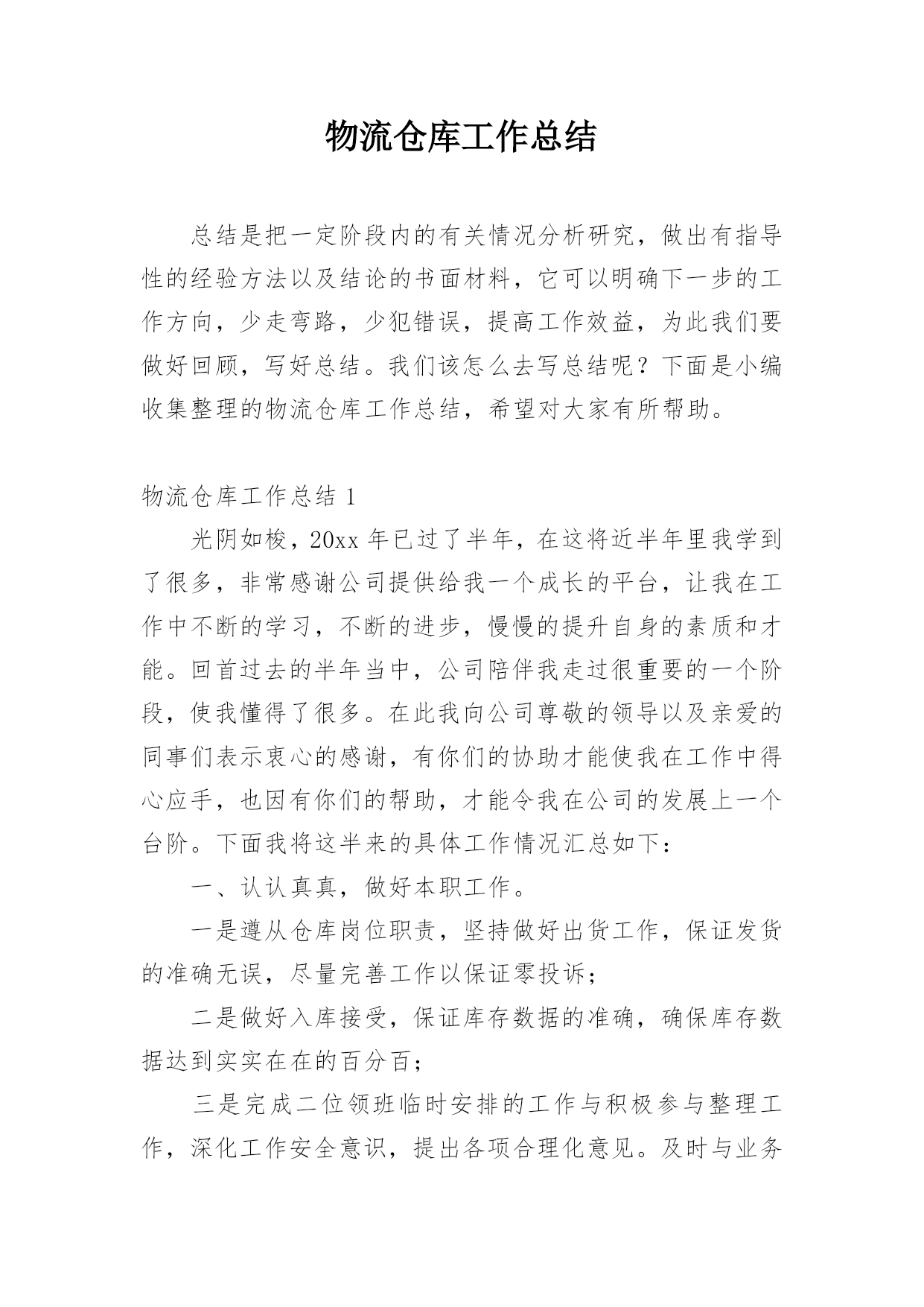 物流仓库工作总结总结是把一定阶段内的有关情况分析研究,做出有指导性的经验方法以及结论的书面材料,它可以明确下一步的工作方向,少走弯路,少犯错误,提高工作效益,为此我们要做好回顾,写好总结。我们该怎么去写总结呢?下面是小编收集整理的物流仓库工作总结,希望对大家有所帮助。物流仓库工作总结1光阴如梭,20xx年已过了半年,在这将近半年里我学到了很多,非常感谢公司提供给我一个成长的平台,让我在工作中不断的学习,不断的进步,慢慢的提升自身的素质和才能。回首过去的半年当中,公司陪伴我走过很重要的一个阶段,使我懂得了很