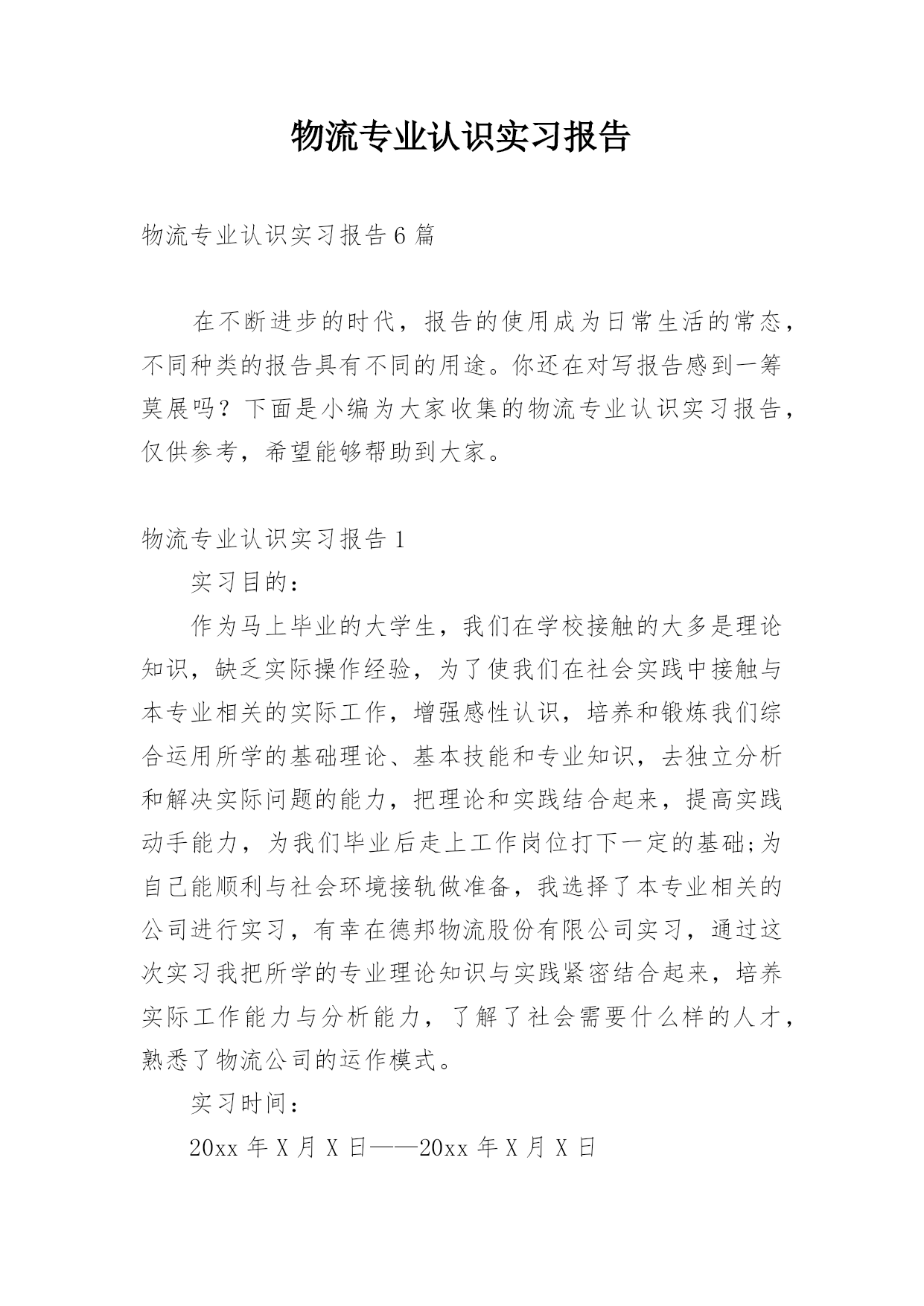 物流专业认识实习报告物流专业认识实习报告6篇在不断进步的时代,报告的使用成为日常生活的常态,不同种类的报告具有不同的用途。你还在对写报告感到一筹莫展吗?下面是小编为大家收集的物流专业认识实习报告,仅供参考,希望能够帮助到大家。物流专业认识实习报告1实习目的:作为马上毕业的大学生,我们在学校接触的大多是理论知识,缺乏实际操作经验,为了使我们在社会实践中接触与本专业相关的实际工作,增强感性认识,培养和锻炼我们综合运用所学的基础理论、基本技能和专业知识,去独立分析和解决实际问题的能力,把理论和实践结合起来,提高