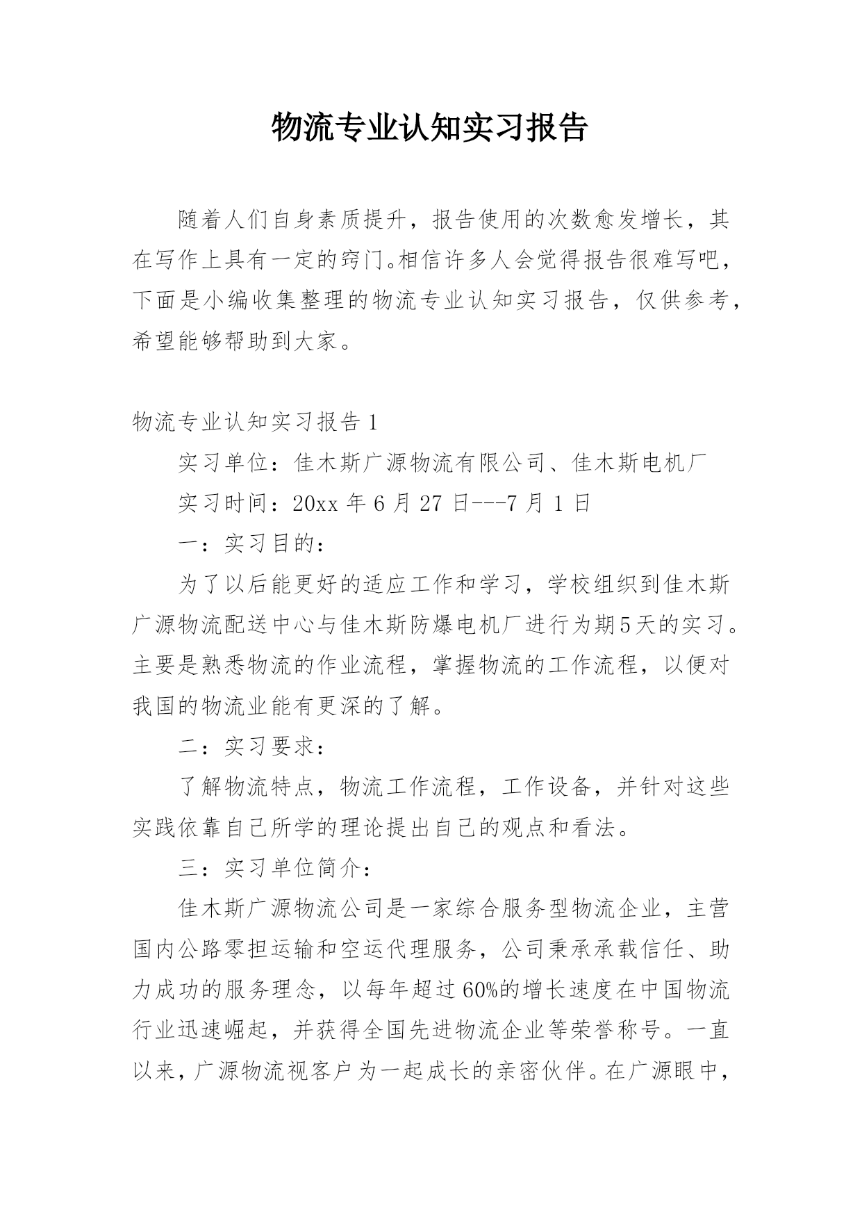物流专业认知实习报告随着人们自身素质提升,报告使用的次数愈发增长,其在写作上具有一定的窍门。相信许多人会觉得报告很难写吧,下面是小编收集整理的物流专业认知实习报告,仅供参考,希望能够帮助到大家。物流专业认知实习报告1实习单位:佳木斯广源物流有限公司、佳木斯电机厂实习时间:20xx年6月27日---7月1日一:实习目的:为了以后能更好的适应工作和学习,学校组织到佳木斯广源物流配送中心与佳木斯防爆电机厂进行为期5天的实习。主要是熟悉物流的作业流程,掌握物流的工作流程,以便对我国的物流业能有更深的了解。二:实习