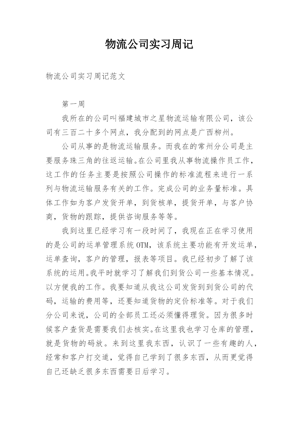 物流公司实习周记物流公司实习周记范文第一周我所在的公司叫福建城市之星物流运输有限公司,该公司有三百二十多个网点,我分配到的网点是广西柳州。公司从事的是物流运输服务。而我在的常州分公司是主要服务珠三角的往返运输。在公司里我从事物流操作员工作,这工作的任务主要是按照公司操作的标准流程来进行一系列与物流运输服务有关的工作。完成公司的业务量标准。具体工作如为客户发货开单,到货核单,提货开单,与客户协商,货物的跟踪,提供咨询服务等等。我到这里已经学习有一段时间了,我现在正在学习使用的是公司的运单管理系统OTM,该系