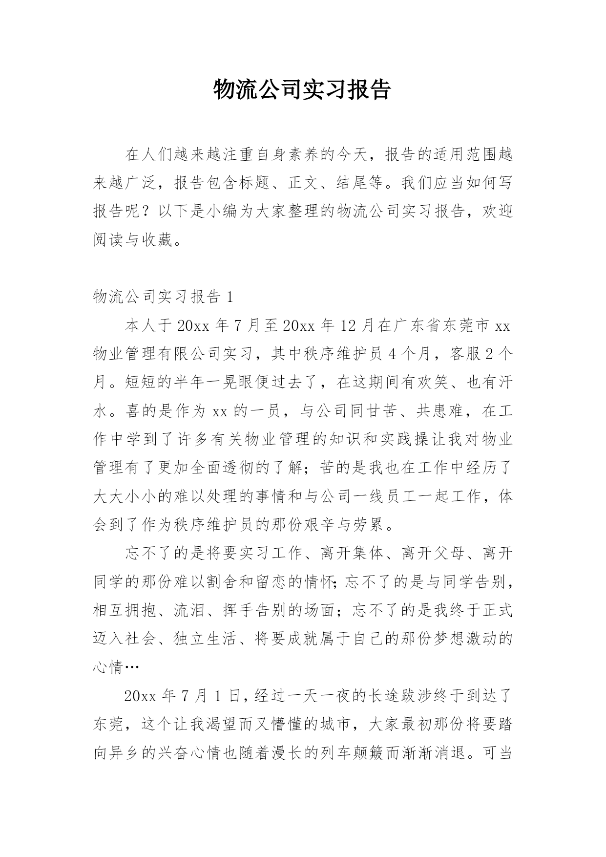 物流公司实习报告在人们越来越注重自身素养的今天,报告的适用范围越来越广泛,报告包含标题、正文、结尾等。我们应当如何写报告呢?以下是小编为大家整理的物流公司实习报告,欢迎阅读与收藏。物流公司实习报告1本人于20xx年7月至20xx年12月在广东省东莞市xx物业管理有限公司实习,其中秩序维护员4个月,客服2个月。短短的半年一晃眼便过去了,在这期间有欢笑、也有汗水。喜的是作为xx的一员,与公司同甘苦、共患难,在工作中学到了许多有关物业管理的知识和实践操让我对物业管理有了更加全面透彻的了解;苦的是我也在工作中经历