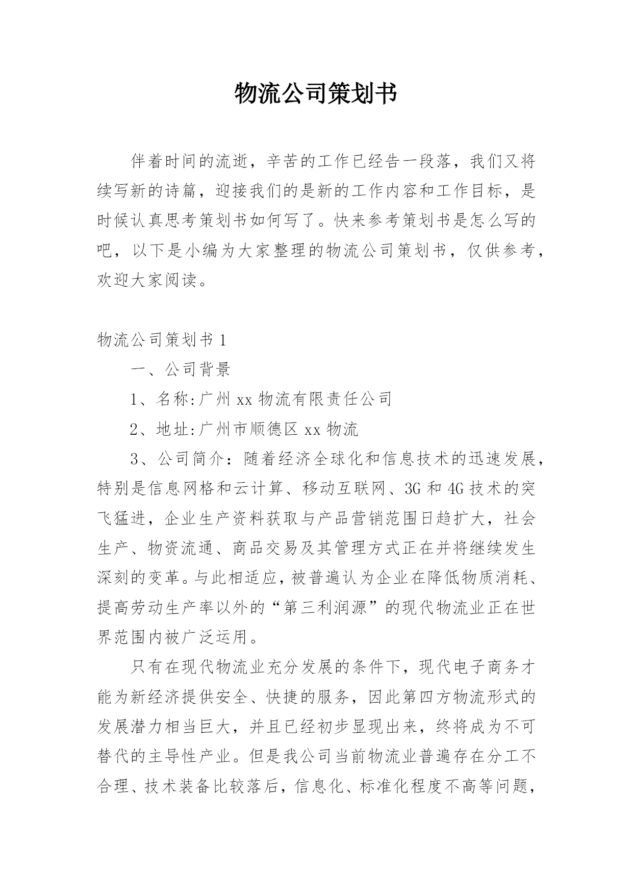 物流公司策划书伴着时间的流逝,辛苦的工作已经告一段落,我们又将续写新的诗篇,迎接我们的是新的工作内容和工作目标,是时候认真思考策划书如何写了。快来参考策划书是怎么写的吧,以下是小编为大家整理的物流公司策划书,仅供参考,欢迎大家阅读。物流公司策划书1一、公司背景1、名称:广州xx物流有限责任公司2、地址:广州市顺德区xx物流3、公司简介:随着经济全球化和信息技术的迅速发展,特别是信息网格和云计算、移动互联网、3G和4G技术的突飞猛进,企业生产资料获取与产品营销范围日趋扩大,社会生产、物资流通、商品交易及其管