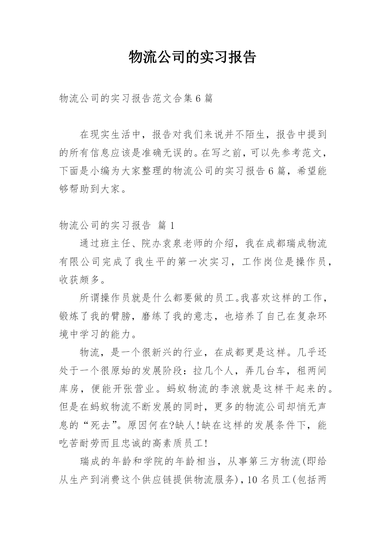 物流公司的实习报告物流公司的实习报告范文合集6篇在现实生活中,报告对我们来说并不陌生,报告中提到的所有信息应该是准确无误的。在写之前,可以先参考范文,下面是小编为大家整理的物流公司的实习报告6篇,希望能够帮助到大家。物流公司的实习报告篇1通过班主任、院办袁泉老师的介绍,我在成都瑞成物流有限公司完成了我生平的第一次实习,工作岗位是操作员,收获颇多。所谓操作员就是什么都要做的员工。我喜欢这样的工作,锻炼了我的臂膀,磨练了我的意志,也培养了自己在复杂环境中学习的能力。物流,是一个很新兴的行业,在成都更是这样。几
