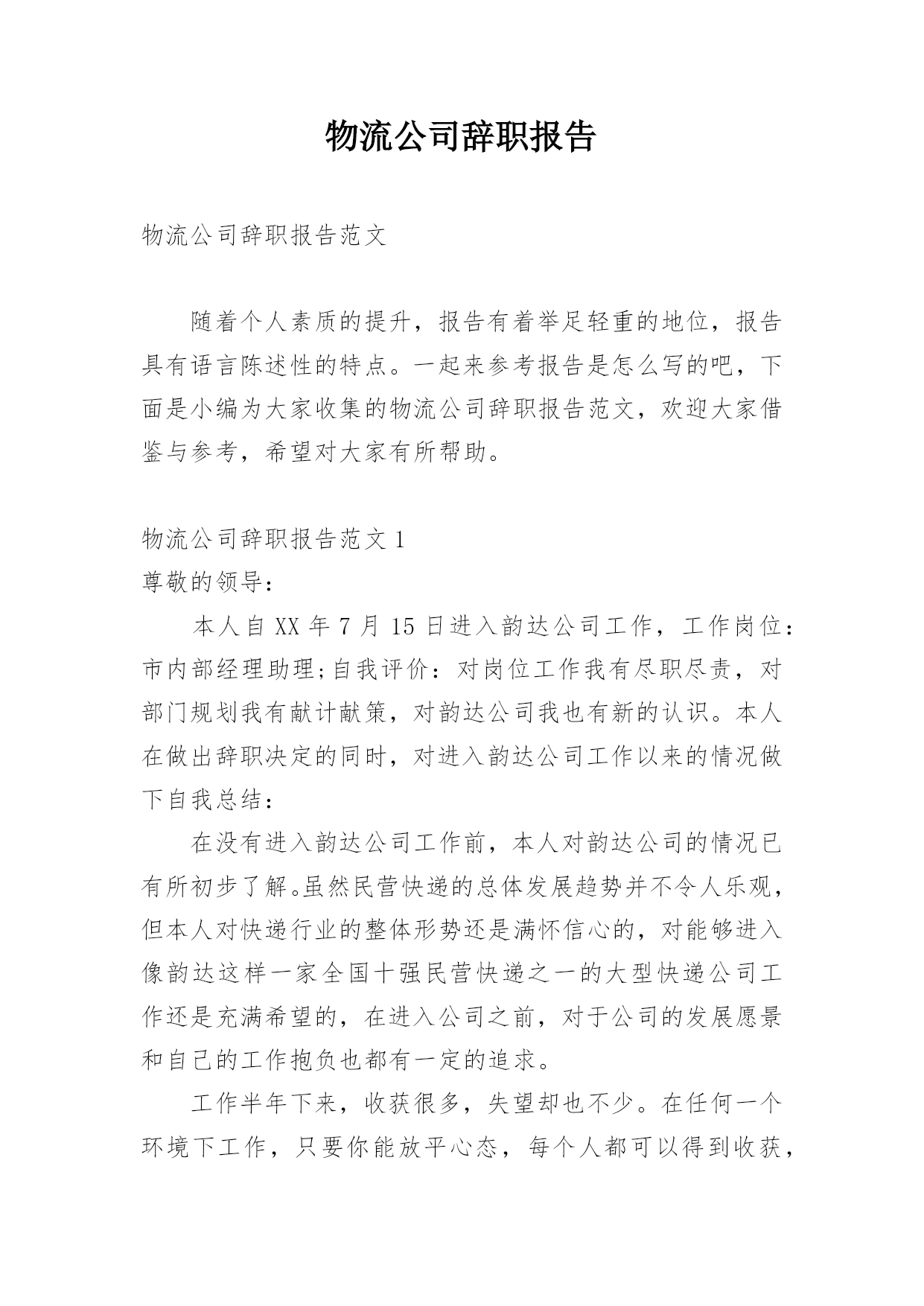 物流公司辞职报告物流公司辞职报告范文随着个人素质的提升,报告有着举足轻重的地位,报告具有语言陈述性的特点。一起来参考报告是怎么写的吧,下面是小编为大家收集的物流公司辞职报告范文,欢迎大家借鉴与参考,希望对大家有所帮助。物流公司辞职报告范文1尊敬的领导:本人自XX年7月15日进入韵达公司工作,工作岗位:市内部经理助理;自我评价:对岗位工作我有尽职尽责,对部门规划我有献计献策,对韵达公司我也有新的认识。本人在做出辞职决定的同时,对进入韵达公司工作以来的情况做下自我总结:在没有进入韵达公司工作前,本人对韵达公司
