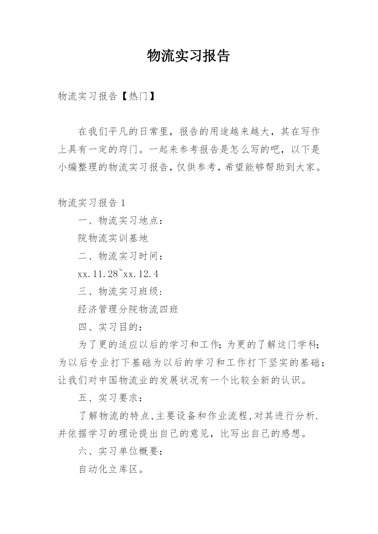 物流实习报告物流实习报告【热门】在我们平凡的日常里,报告的用途越来越大,其在写作上具有一定的窍门。一起来参考报告是怎么写的吧,以下是小编整理的物流实习报告,仅供参考,希望能够帮助到大家。物流实习报告1一、物流实习地点:院物流实训基地二、物流实习时间:xx.11.28~xx.12.4三、物流实习班级:经济管理分院物流四班四、实习目的:为了更的适应以后的学习和工作;为更的了解这门学科;为以后专业打下基础为以后的学习和工作打下坚实的基础;让我们对中国物流业的发展状况有一个比较全新的认识。五、实习要求:了解物流的