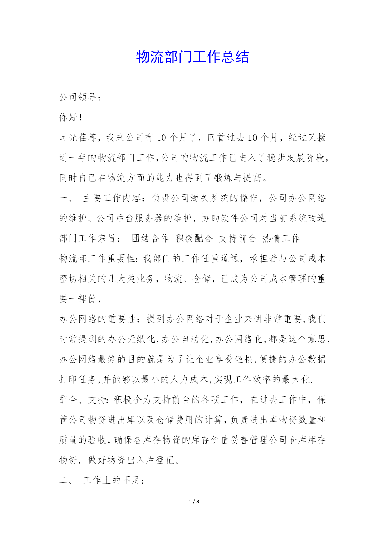 PAGE3/NUMPAGES3物流部门工作总结公司领导:你好!时光荏苒,我来公司有10个月了,回首过去10个月,经过又接近一年的物流部门工作,公司的物流工作已进入了稳步发展阶段,同时自己在物流方面的能力也得到了锻炼与提高。一、主要工作内容:负责公司海关系统的操作,公司办公网络的维护、公司后台服务器的维护,协助软件公司对当前系统改造部门工作宗旨:团结合作积极配合支持前台热情工作物流部工作重要性:我部门的工作任重道远,承担着与公司成本密切相关的几大类业务,物流、仓储,已成为公司成本管理的重要一部份