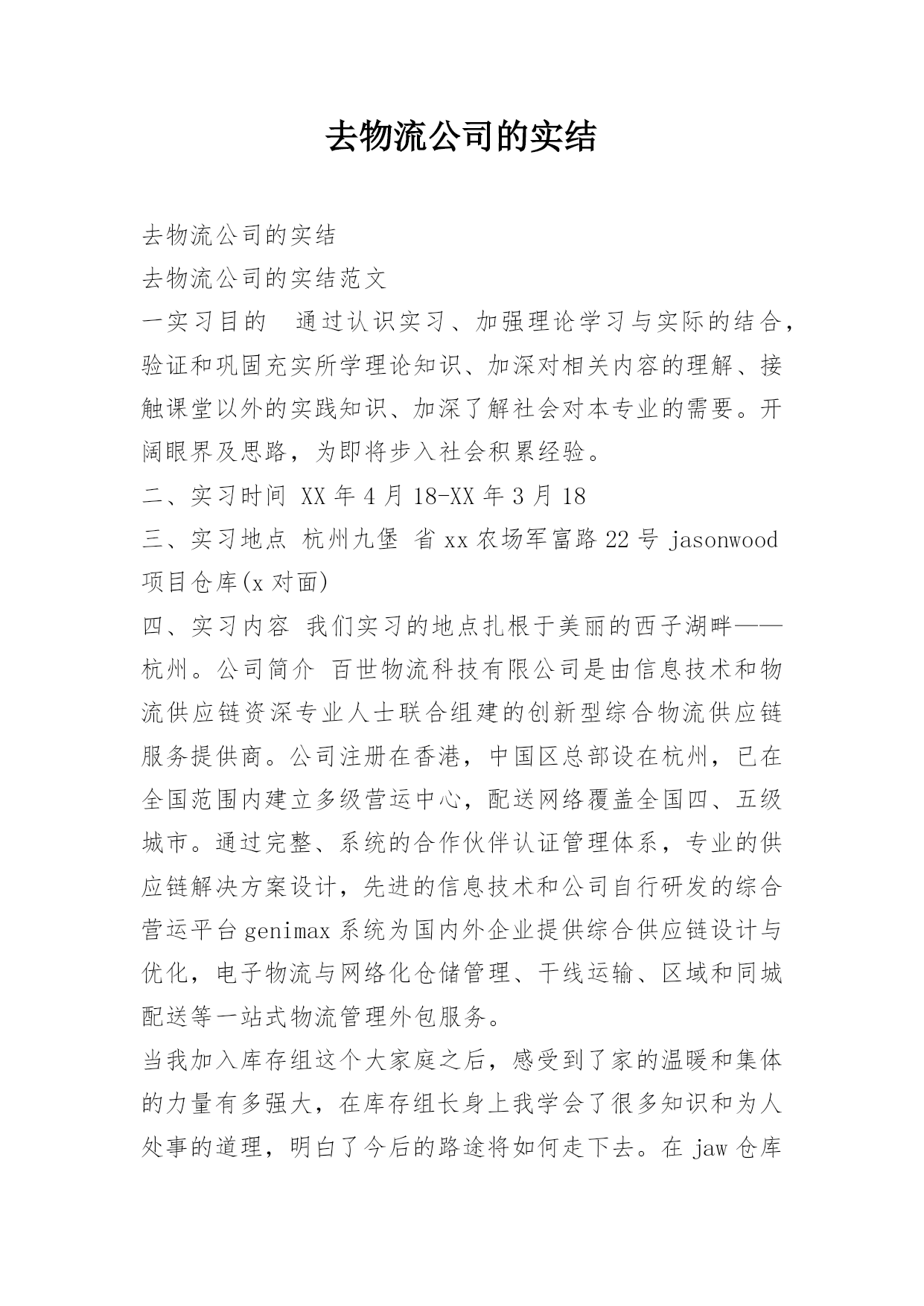 去物流公司的实结去物流公司的实结去物流公司的实结范文一实习目的通过认识实习、加强理论学习与实际的结合,验证和巩固充实所学理论知识、加深对相关内容的理解、接触课堂以外的实践知识、加深了解社会对本专业的需要。开阔眼界及思路,为即将步入社会积累经验。二、实习时间XX年4月18-XX年3月18三、实习地点杭州九堡省xx农场军富路22号jasonwood项目仓库(x对面)四、实习内容我们实习的地点扎根于美丽的西子湖畔——杭州。公司简介百世物流科技有限公司是由信息技术和物流供应链资深专业人士联合组建的创新型综合物流供