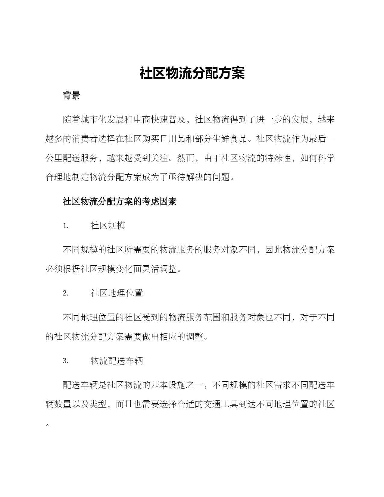 社区物流分配方案背景随着城市化发展和电商快速普及,社区物流得到了进一步的发展,越来越多的消费者选择在社区购买日用品和部分生鲜食品。社区物流作为最后一公里配送服务,越来越受到关注。然而,由于社区物流的特殊性,如何科学合理地制定物流分配方案成为了亟待解决的问题。社区物流分配方案的考虑因素社区规模不同规模的社区所需要的物流服务的服务对象不同,因此物流分配方案必须根据社区规模变化而灵活调整。社区地理位置不同地理位置的社区受到的物流服务范围和服务对象也不同,对于不同的社区物流分配方案需要做出相应的调整。物流配送车辆