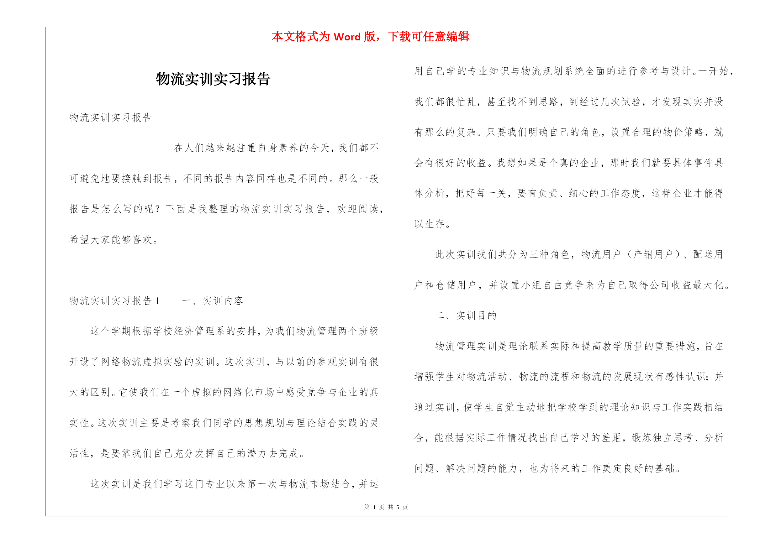 本文格式为Word版,下载可任意编辑第PAGE\*MERGEFORMAT5页共NUMPAGES\*MERGEFORMAT5页物流实训实习报告物流实训实习报告在人们越来越注重自身素养的今天,我们都不可避免地要接触到报告,不同的报告内容同样也是不同的。那么一般报告是怎么写的呢?下面是我整理的物流实训实习报告,欢迎阅读,希望大家能够喜欢。物流实训实习报告1一、实训内容这个学期根据学校经济管理系的安排,为我们物流管理两个班级开设了网络物流虚拟实验的实训。这次实训,与以前的参观实训有很大的区别。它使我们