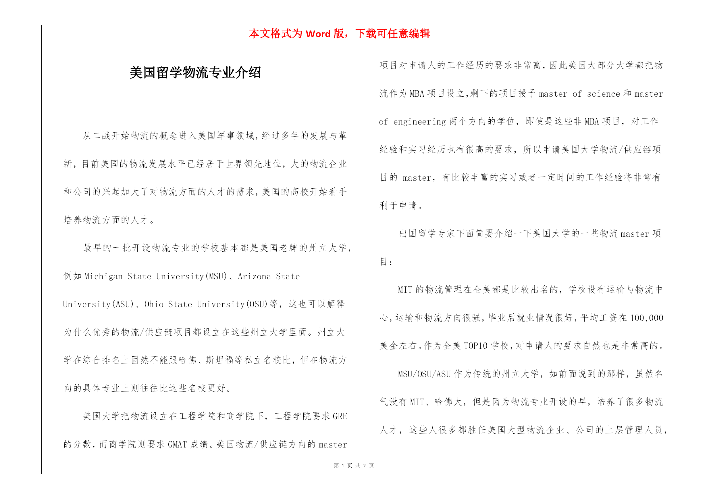 本文格式为Word版,下载可任意编辑第PAGE\*MERGEFORMAT2页共NUMPAGES\*MERGEFORMAT2页美国留学物流专业介绍从二战开始物流的概念进入美国军事领域,经过多年的发展与革新,目前美国的物流发展水平已经居于世界领先地位,大的物流企业和公司的兴起加大了对物流方面的人才的需求,美国的高校开始着手培养物流方面的人才。最早的一批开设物流专业的学校基本都是美国老牌的州立大学,例如MichiganStateUniversity(MSU)、ArizonaStateUniversi
