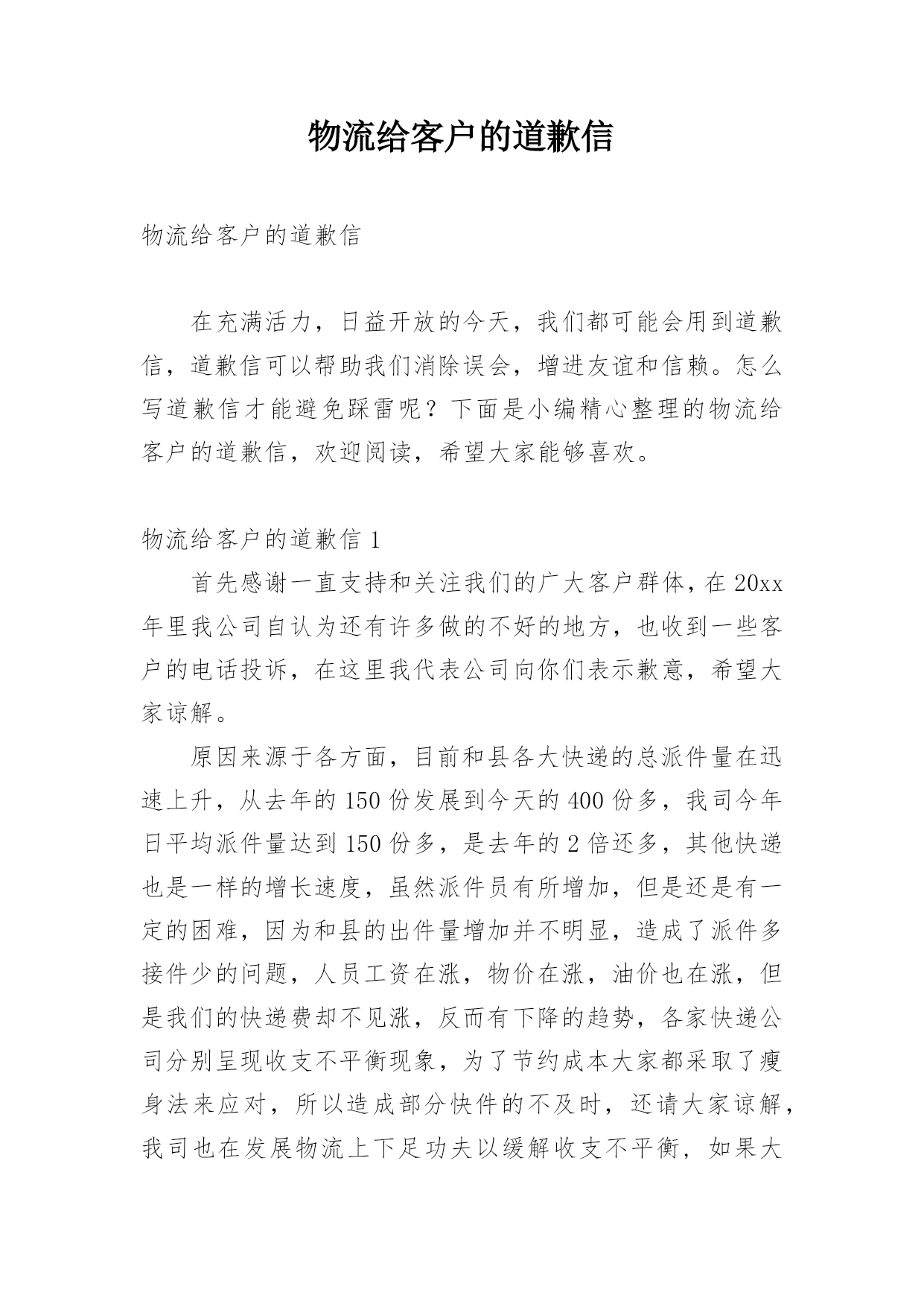 物流给客户的道歉信物流给客户的道歉信在充满活力,日益开放的今天,我们都可能会用到道歉信,道歉信可以帮助我们消除误会,增进友谊和信赖。怎么写道歉信才能避免踩雷呢?下面是小编精心整理的物流给客户的道歉信,欢迎阅读,希望大家能够喜欢。物流给客户的道歉信1首先感谢一直支持和关注我们的广大客户群体,在20xx年里我公司自认为还有许多做的不好的地方,也收到一些客户的电话投诉,在这里我代表公司向你们表示歉意,希望大家谅解。原因来源于各方面,目前和县各大快递的总派件量在迅速上升,从去年的150份发展到今天的400份多,我