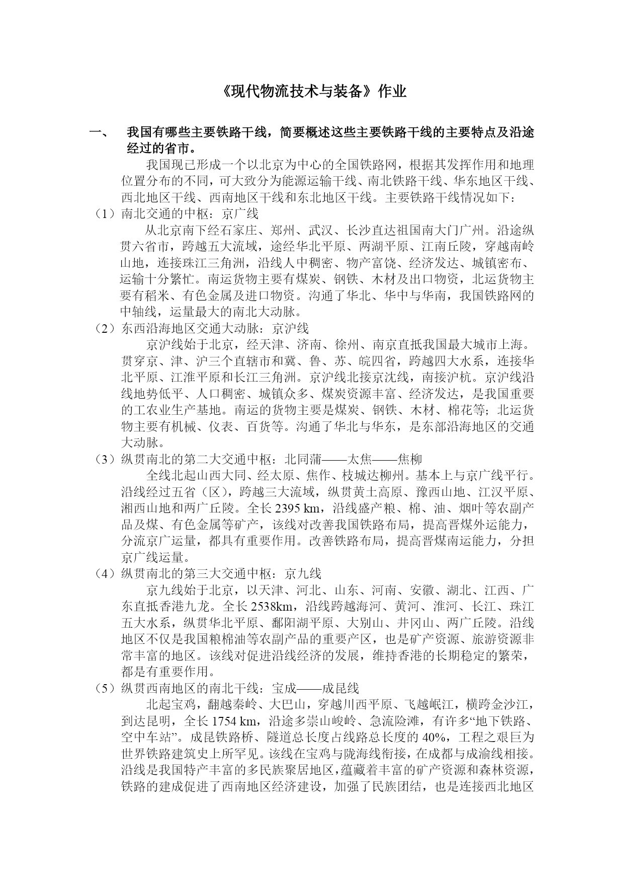 《现代物流技术与装备》作业我国有哪些主要铁路干线,简要概述这些主要铁路干线的主要特点及沿途经过的省市。我国现已形成一个以北京为中心的全国铁路网,根据其发挥作用和地理位置分布的不同,可大致分为能源运输干线、南北铁路干线、华东地区干线、西北地区干线、西南地区干线和东北地区干线。主要铁路干线情况如下:(1)南北交通的中枢:京广线从北京南下经石家庄、郑州、武汉、长沙直达祖国南大门广州。沿途纵贯六省市,跨越五大流域,途经华北平原、两湖平原、江南丘陵,穿越南岭山地,连接珠江三角洲,沿线人中稠密、物产富饶、经济发达、城