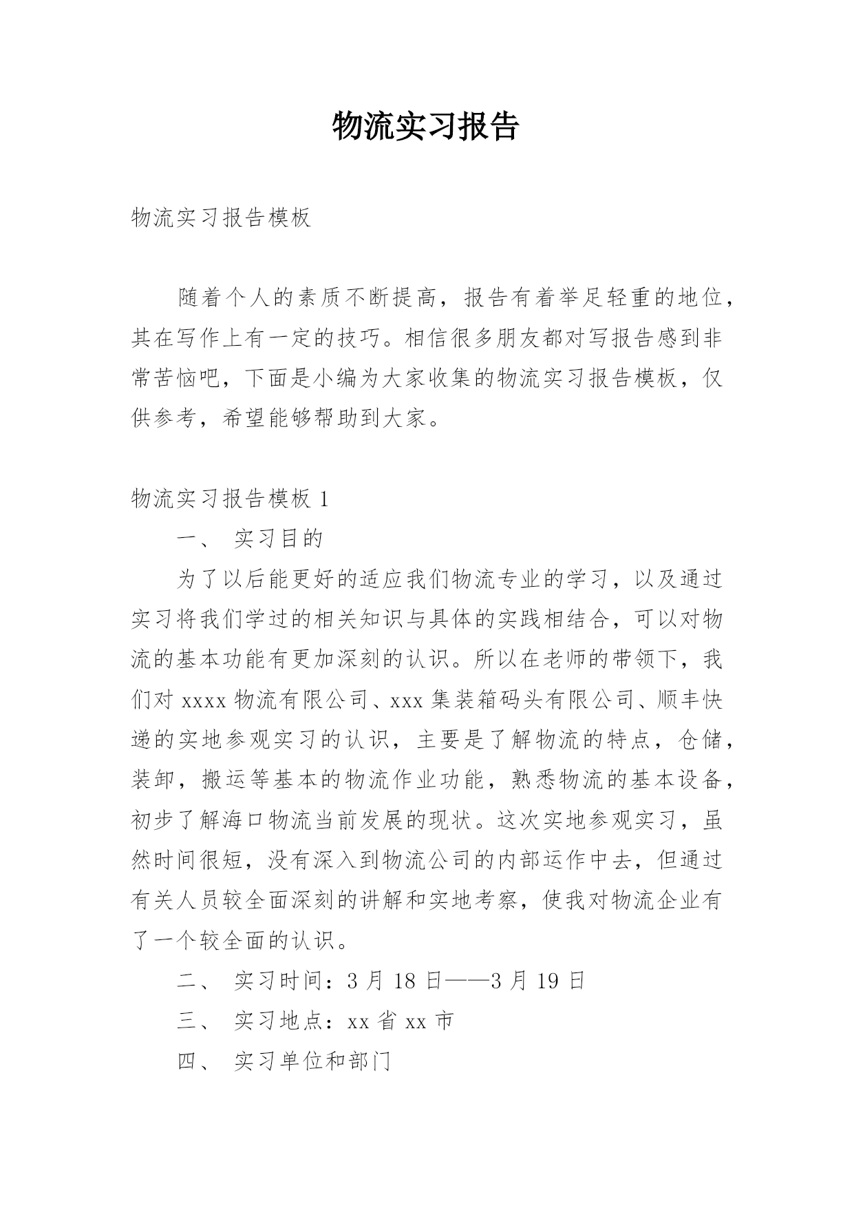 物流实习报告物流实习报告模板随着个人的素质不断提高,报告有着举足轻重的地位,其在写作上有一定的技巧。相信很多朋友都对写报告感到非常苦恼吧,下面是小编为大家收集的物流实习报告模板,仅供参考,希望能够帮助到大家。物流实习报告模板1一、实习目的为了以后能更好的适应我们物流专业的学习,以及通过实习将我们学过的相关知识与具体的实践相结合,可以对物流的基本功能有更加深刻的认识。所以在老师的带领下,我们对xxxx物流有限公司、xxx集装箱码头有限公司、顺丰快递的实地参观实习的认识,主要是了解物流的特点,仓储,装卸,搬运