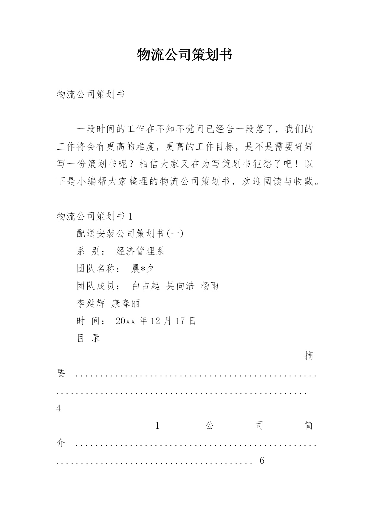 物流公司策划书物流公司策划书一段时间的工作在不知不觉间已经告一段落了,我们的工作将会有更高的难度,更高的工作目标,是不是需要好好写一份策划书呢?相信大家又在为写策划书犯愁了吧!以下是小编帮大家整理的物流公司策划书,欢迎阅读与收藏。物流公司策划书1配送安装公司策划书(一)系别:经济管理系团队名称:晨*夕团队成员:白占起吴向浩杨雨李延辉康春丽时间:20xx年12月17日目录摘要...................................................................