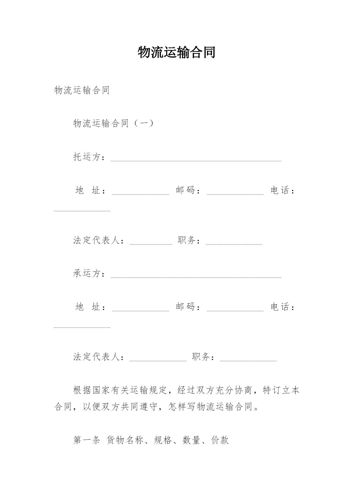 物流运输合同物流运输合同物流运输合同(一)托运方:____________________________________地址:____________邮码:____________电话:____________法定代表人:_________职务:____________承运方:____________________________________地址:____________邮码:____________电话:____________法定代表人:____________职务:____________根
