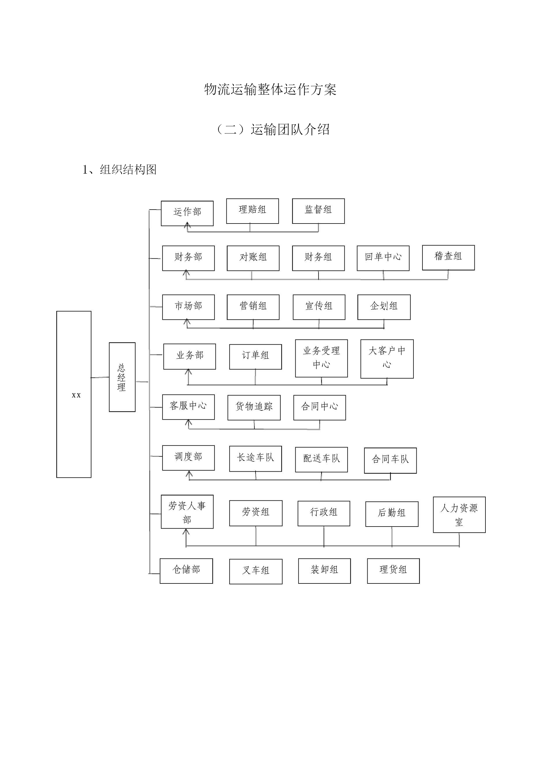 物流运输整体运作方案(二)运输团队介绍1、组织结构图2、能力介绍2.1运作部(1)运作部监管职能包括理赔与监督;收集经营信息,掌握市场动态,深入调查研究,为公司决策提供依据。(2)开拓市场,及时了解新技术、新项目、新思路;对外联络,寻找合作项目,引入资金,开发新的经营市场;对新项目进行可行性分析工作,提交新项目可行性分析报告,并对新项目进行经营策划、投资分析等。(3)进行企业经营策划、投资策划等方面的工作。(4)对外联系、联络、接待以及公关工作。2.2财务部(1)负责公司日常财务核算,参与公司的经营管理。