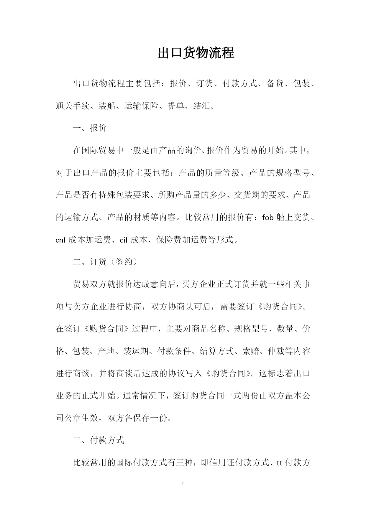 PAGEPAGE3出口货物流程出口货物流程主要包括:报价、订货、付款方式、备货、包装、通关手续、装船、运输保险、提单、结汇。一、报价在国际贸易中一般是由产品的询价、报价作为贸易的开始。其中,对于出口产品的报价主要包括:产品的质量等级、产品的规格型号、产品是否有特殊包装要求、所购产品量的多少、交货期的要求、产品的运输方式、产品的材质等内容。比较常用的报价有:fob船上交货、cnf成本加运费、cif成本、保险费加运费等形式。二、订货(签约)贸易双方就报价达成意向后,买方企业正式订货并就一些相关事项