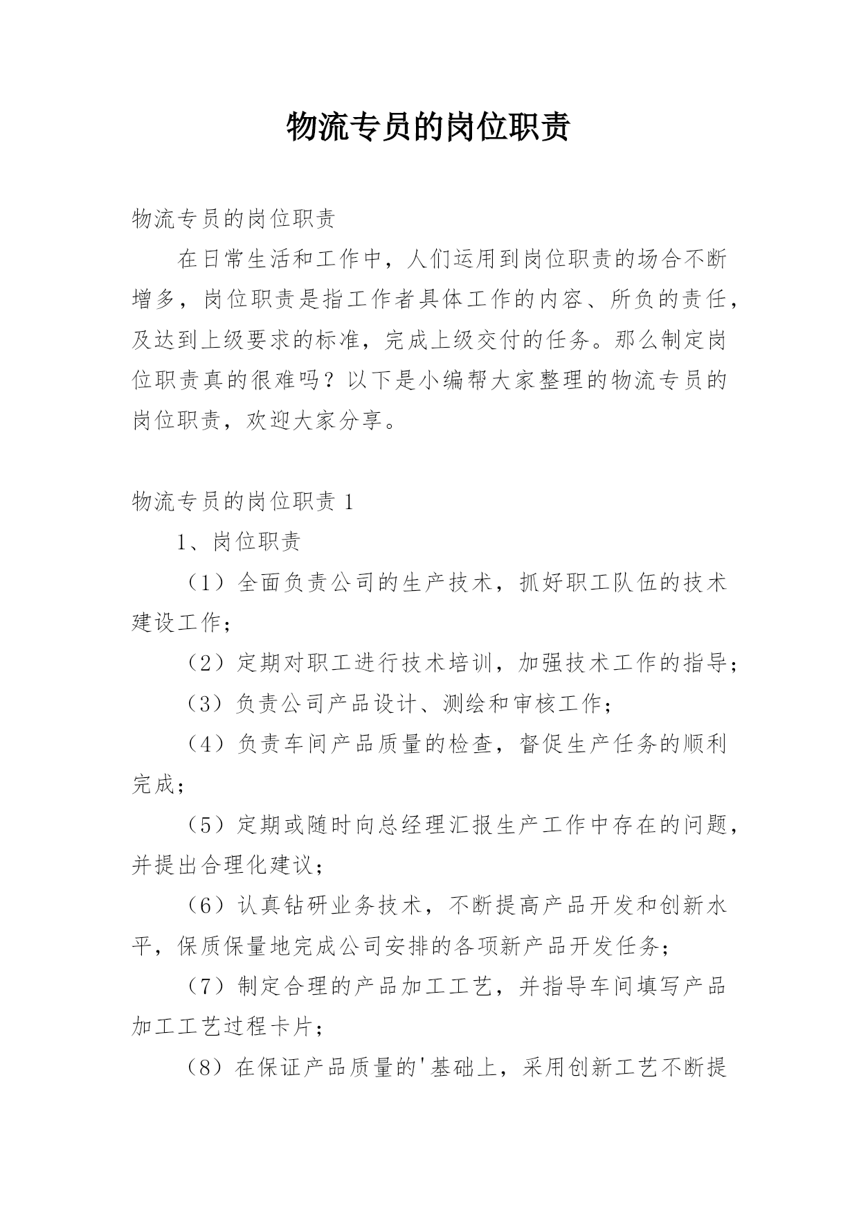 物流专员的岗位职责物流专员的岗位职责在日常生活和工作中,人们运用到岗位职责的场合不断增多,岗位职责是指工作者具体工作的内容、所负的责任,及达到上级要求的标准,完成上级交付的任务。那么制定岗位职责真的很难吗?以下是小编帮大家整理的物流专员的岗位职责,欢迎大家分享。物流专员的岗位职责11、岗位职责(1)全面负责公司的生产技术,抓好职工队伍的技术建设工作;(2)定期对职工进行技术培训,加强技术工作的指导;(3)负责公司产品设计、测绘和审核工作;(4)负责车间产品质量的检查,督促生产任务的顺利完成;(5)定期或随